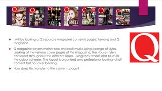 The document analyzes the contents pages of two magazines - Q Magazine and Kerrang Magazine. For both magazines, the contents page transfers the overall house style and design elements from the magazine covers. However, Q Magazine has a more organized and formal layout, while Kerrang Magazine has a more cluttered layout that reflects the punk genre's attitude. Both magazines effectively communicate their distinct styles and target audiences through their contents page designs.