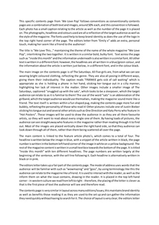 This contents page from 'We Love Pop' magazine follows conventions for content pages with around 50% text and images. The photos have captions and page numbers relating to the articles. The fonts, colors, and logo maintain the magazine's brand identity. An editor's letter introduces the issue in an informal, friendly voice. The layout is clear with the main story and photos prominently displayed. Bright colors like pink, yellow, and blue create an upbeat style appealing to the target audience.