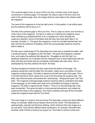 The document provides an analysis of the contents page of a teenage magazine called "We Love Pop". It summarizes the key design elements and conventions used: