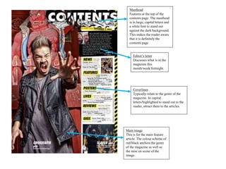 This document analyzes the key elements of a magazine contents page, including the main image, masthead, editor's letter, coverlines, subsidiary images, subheadings, headlines, date, page numbers, image captions, graphic features, and typography. The main image and color scheme are used to represent the magazine's genre. The masthead is in large, capital letters to stand out from the background. Coverlines, subheadings, and headlines are designed to attract readers to specific articles. Subsidiary images, page numbers, and dates provide additional information to readers. Together, these elements are carefully crafted to entice readers and convey what the magazine offers.