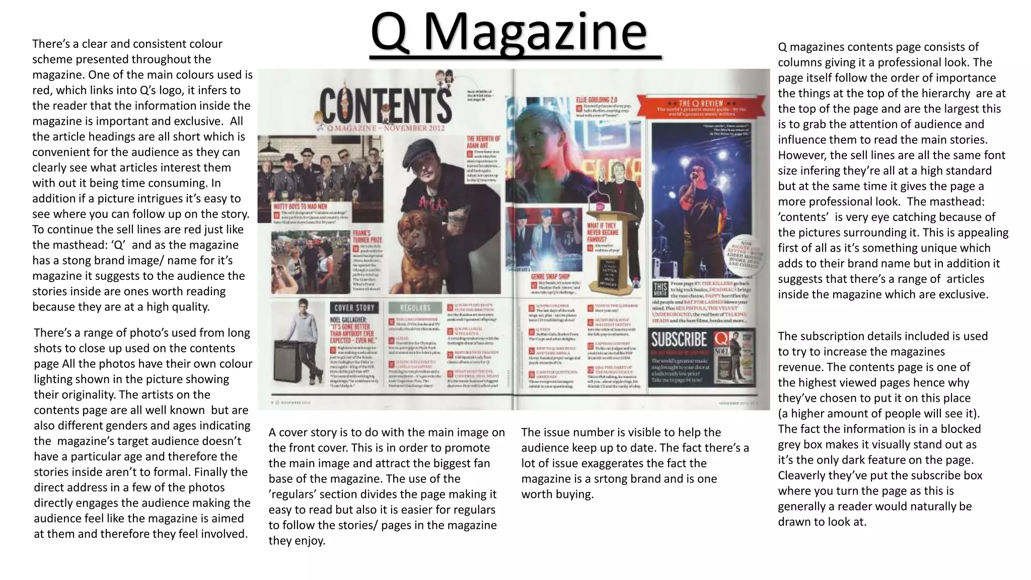 The document provides details about the contents pages of four different magazines: Q Magazine, Billboard, Vibe, and NME. Some key points: