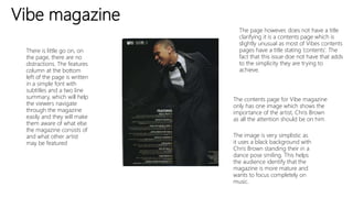The document analyzes and compares the contents pages of three music magazines: Vibe, Q, and Mojo. It finds that Vibe's contents page is very simplistic, featuring only a single image of Chris Brown and focusing on him without distractions. Q's contents page clearly labels itself as "contents" and includes artist pictures and information about subscribing. Mojo's stands out by prominently featuring only the most important articles, separating the cover story, using sophisticated colors, and including a pull quote to draw attention.