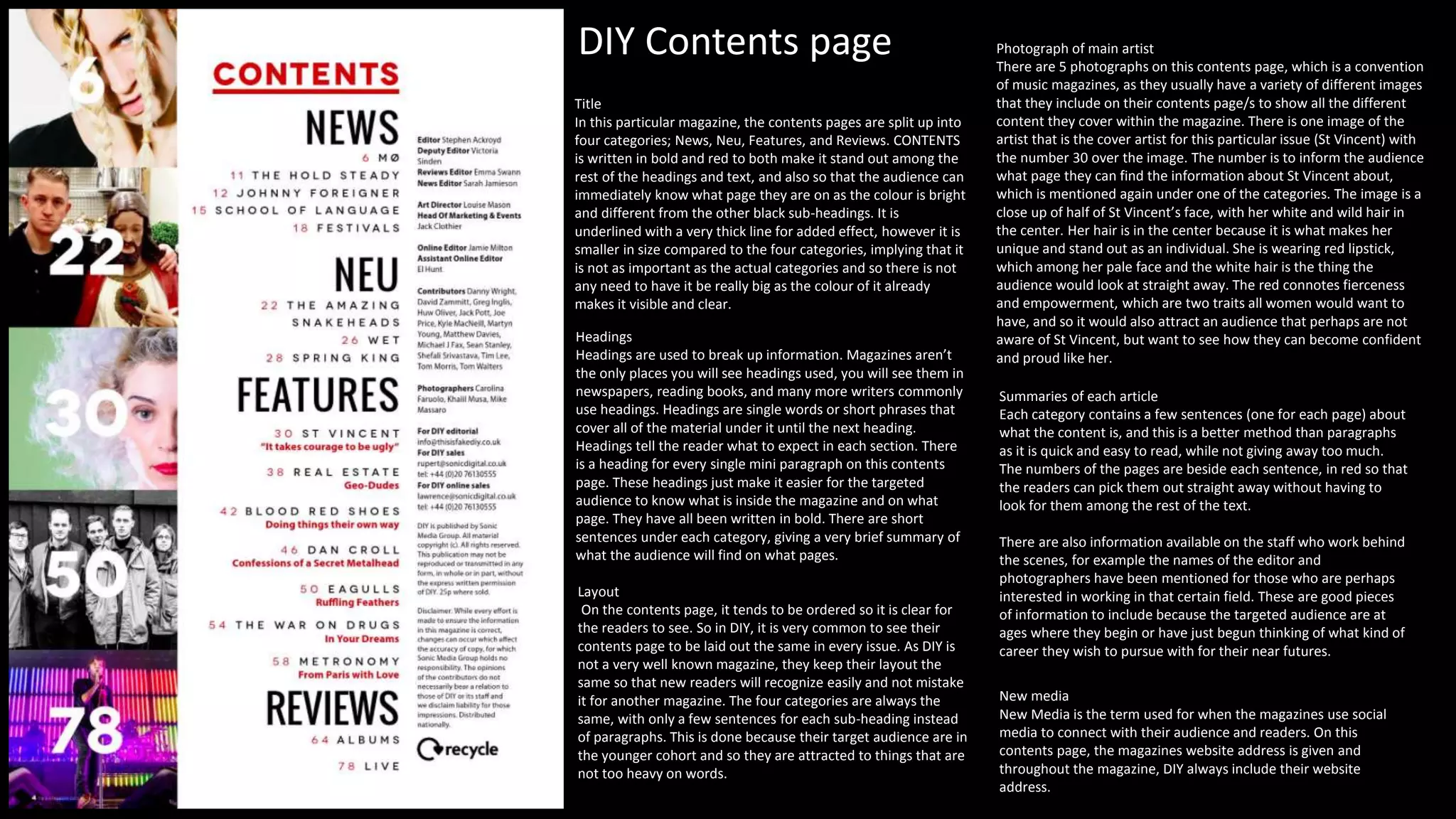 The document provides details about the contents page of a magazine. It describes the layout, including four categories at the top in bold and red. Headings are used throughout in bold to break up sections. There are five photographs, including a close-up of the cover artist St Vincent with red lipstick to convey fierceness. Short summaries are provided for each article, and staff names are mentioned for those interested in related careers. The magazine's website is also listed for connecting with readers online.