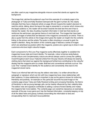 The document analyzes and compares the contents pages of two teen pop magazines, We Love Pop and Top of the Pops. It discusses the layout, visual design, language, and conventions used on each page to attract their target audiences of teenage girls. Both magazines employ bright colors, images of celebrities, and brief article descriptions to grab readers' attention. However, We Love Pop uses a busier, more image-heavy design while Top of the Pops focuses more on information. The analysis shows how each magazine effectively brands itself and connects with readers through their contents pages.
