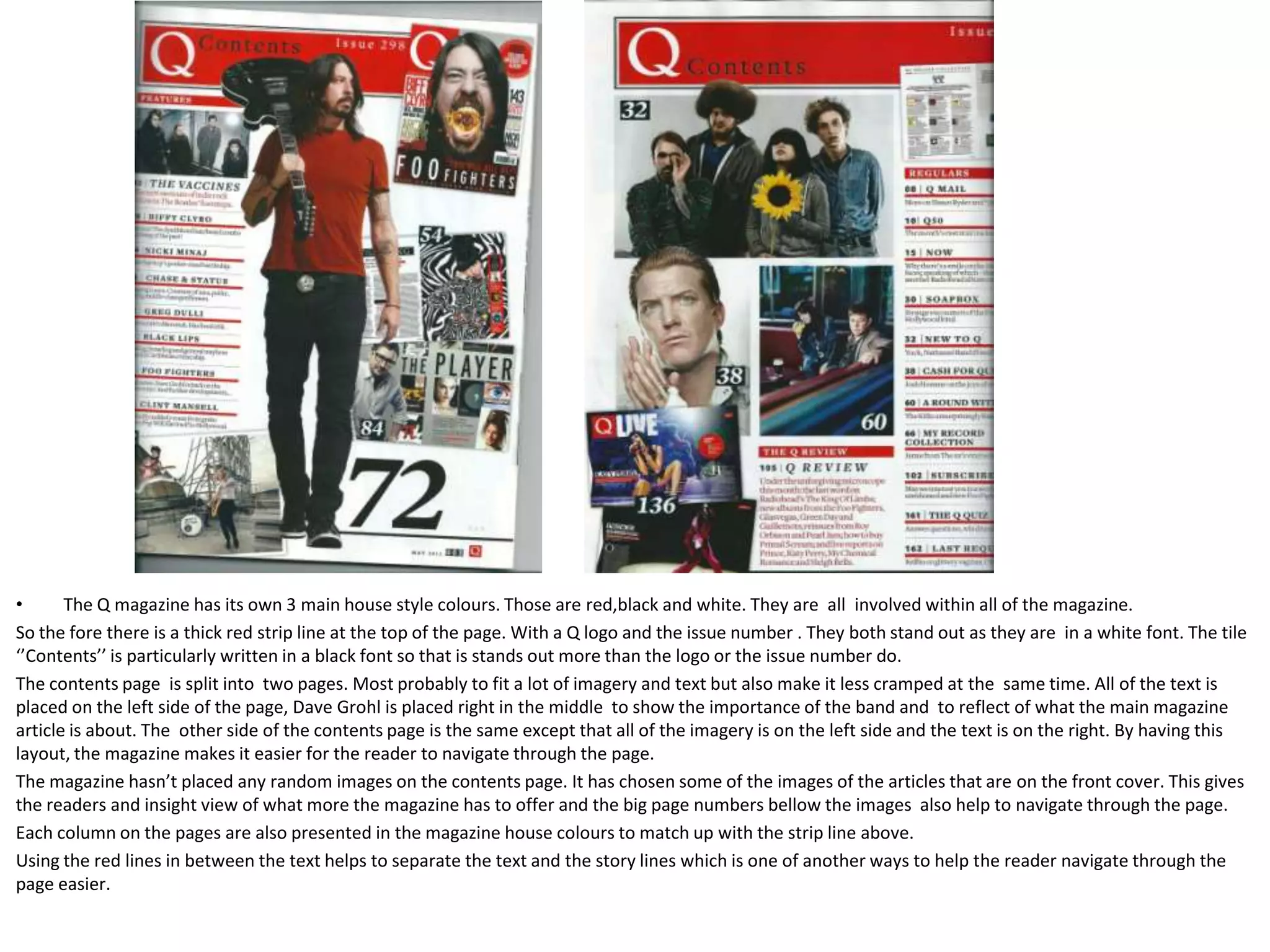 The Q magazine contents page uses red, black, and white as its main colors throughout. It has a thick red strip along the top with the logo and issue number in white. The title "Contents" is in black to stand out. The page is split into two columns to fit imagery and text without being cramped. Images from cover stories are included to preview content. Red lines separate sections and columns use the magazine's colors to match the top strip.