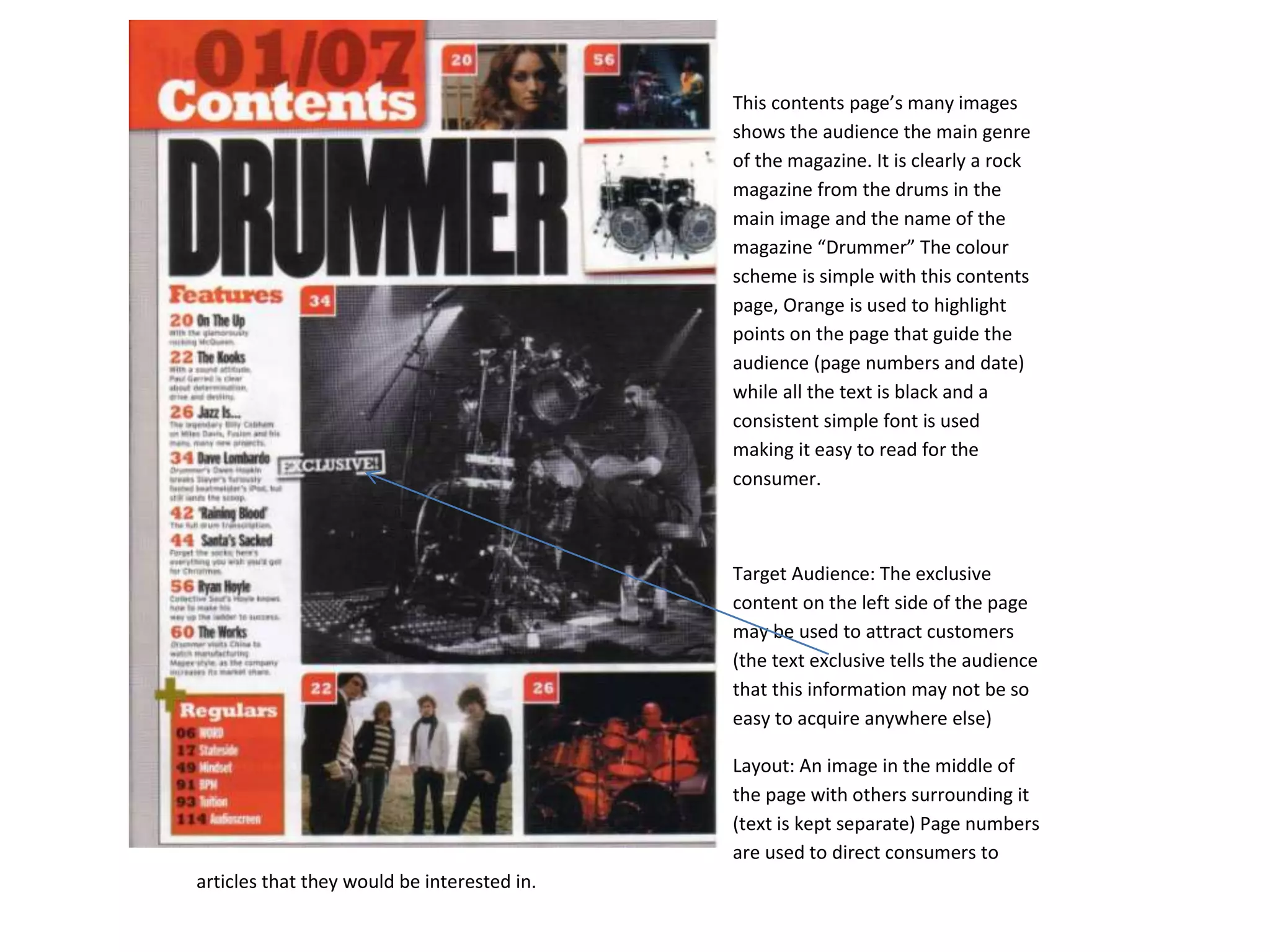 This contents page for a rock magazine called "Drummer" uses images of drums and guitars to clearly indicate its genre. Orange text is used to highlight important details like page numbers and dates, while other text remains black for easy reading. The page features exclusive content on the left to attract customers, with an image in the center surrounded by other images and separate text sections. It uses various typography styles and band listings to easily engage audiences and influence purchases.