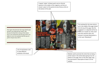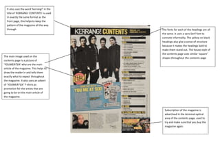 The document summarizes and compares the contents pages of two music magazines - Kerrang! and Uncut. Kerrang!'s contents page has an informal style with colorful graphics and ads. It promotes the main article band through their photo and T-shirt ad. Uncut's contents page has a formal, tidy style with one large photo and sections clearly organized under headings. It includes an article by the editor on the right side. Both contents pages aim to entice readers with previews of the magazine's articles and promotions.