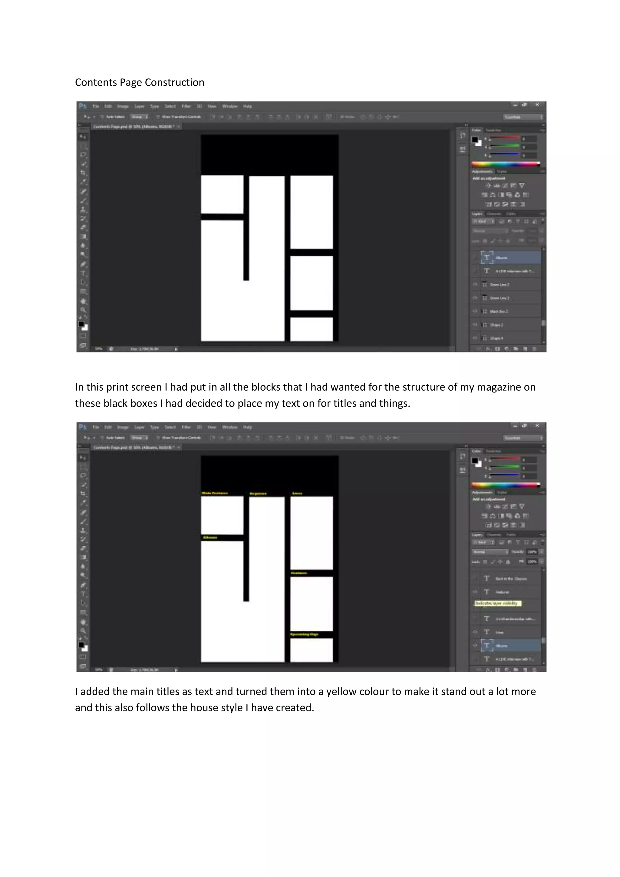 The document describes the steps taken to construct a contents page for a magazine mock-up. Key elements include adding titles in yellow text within black boxes to make them stand out, altering photos to improve brightness/contrast, creating a "sticker" with slanted text in the bottom corner, adding numbered text in red circles, and including a resized sound logo. The contents page brings together these designed elements on mock magazine pages.