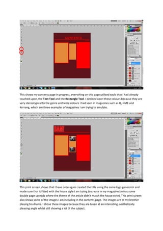 This document summarizes the steps taken to create a magazine contents page in Photoshop, including adding text, images, shapes, and effects. The creator chose colors and styles inspired by rock music magazines. Images of the creator's brother playing drums were included. Text was added to list the issue number, month, and article titles. Rectangles, auto shapes, and overlays were utilized to organize sections and add depth. The finished contents page was reviewed and updated based on conventions from professional magazines.