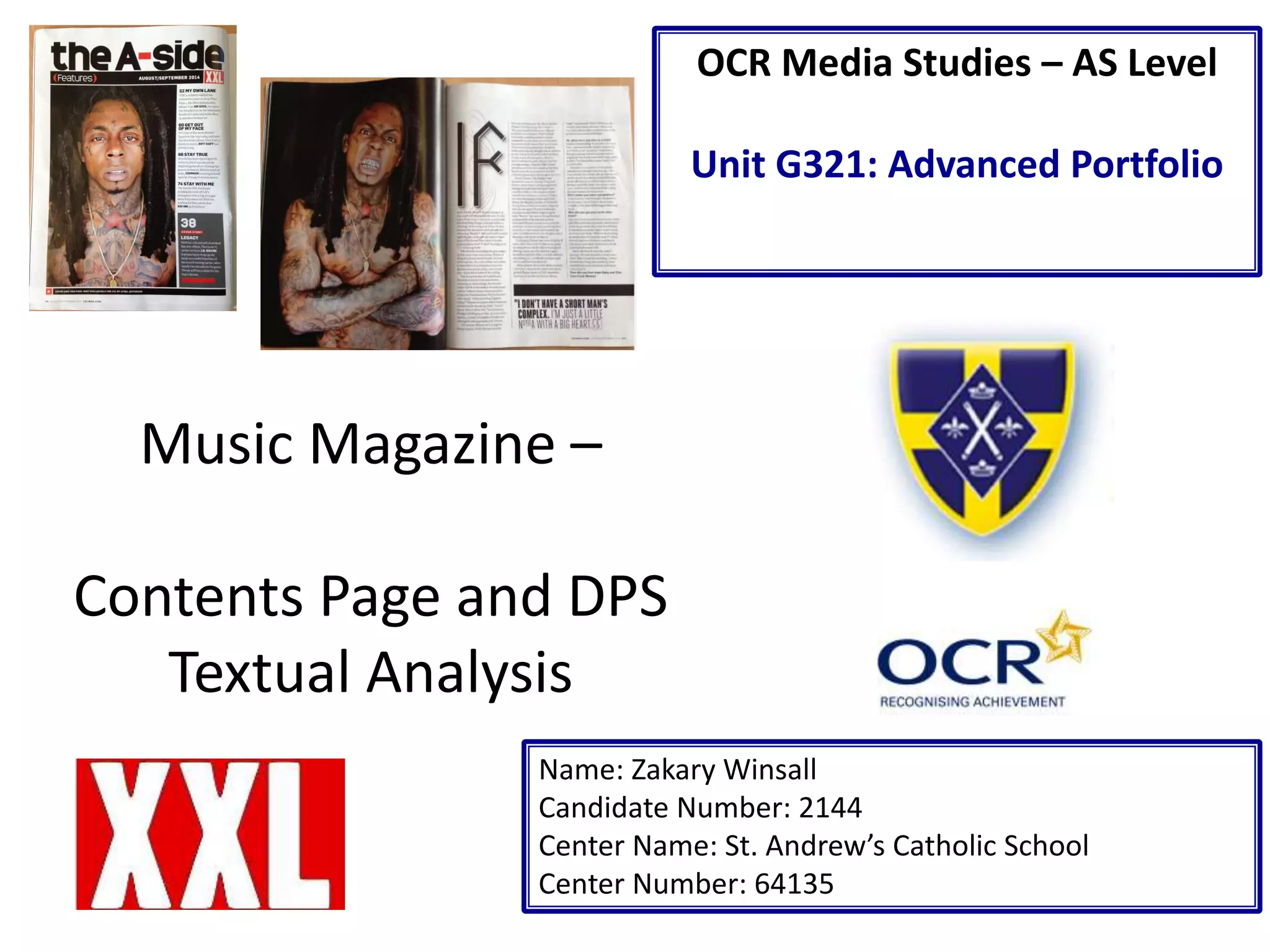 This document analyzes the layout and design of an issue of XXL magazine. It discusses features of the contents page like the logo, main image, subheadings, and page numbers. It also examines aspects of article pages like the editor's signature and details, main images, quotes, drop caps, and Q&A format. The conclusion notes simple design elements that could be replicated for a rap magazine, such as black bars, quote boxes, and large drop caps to draw readers in.