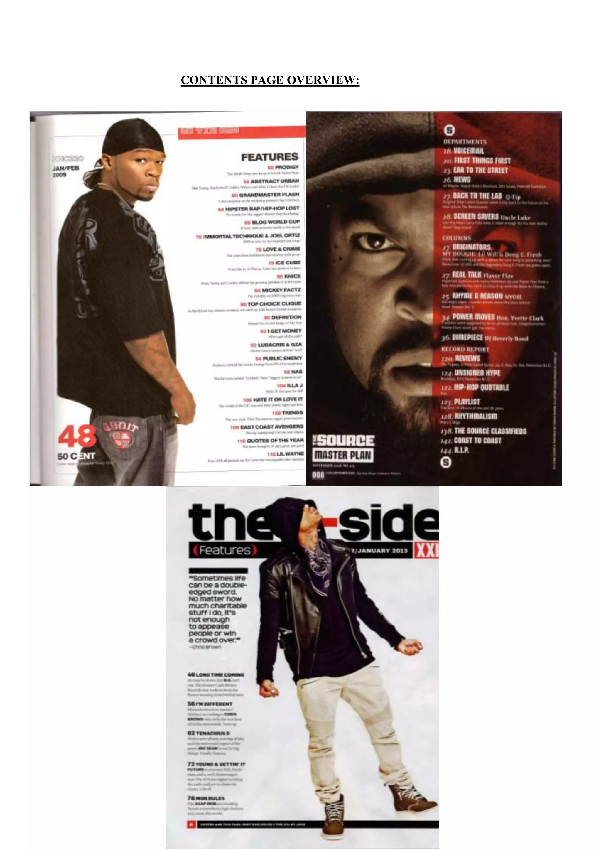 The document provides an overview and analysis of the contents pages from three hip-hop magazines. It notes that all three magazines prominently feature the artist also on the front cover. The contents lists are displayed clearly separated from the artist image through composition. The pages use typical magazine conventions like bold subheadings to highlight sections. One artist's page stands out by including a pull quote beside his image to catch readers' attention. Overall, the contents pages are analyzed to reinforce stereotypes through focusing on black male artists displayed in intimidating but powerful poses and using masculine colors like red, black, and white.