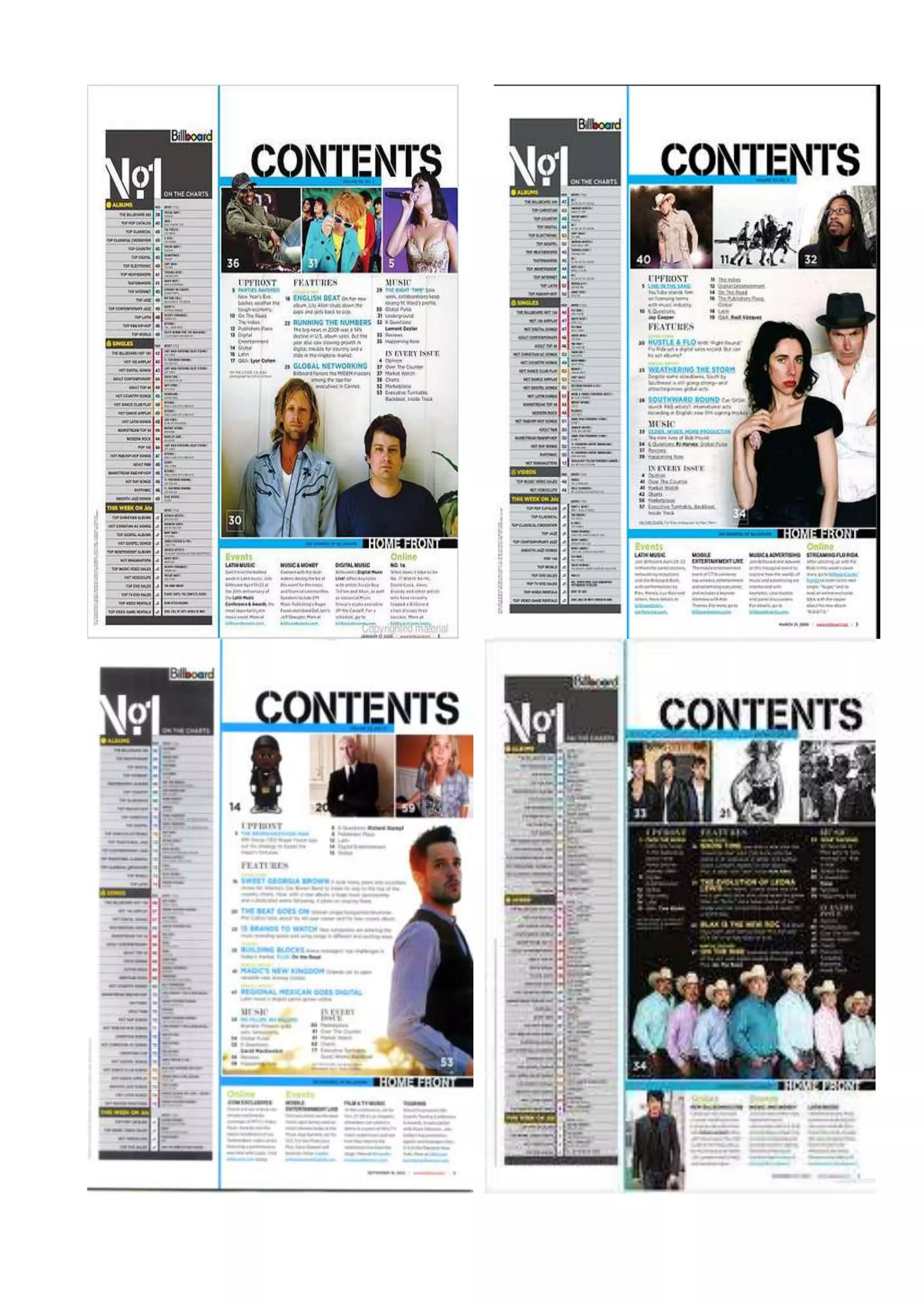 The document discusses the contents pages of a billboard music magazine. It notes that there is a strong connection between the six contents pages, as they all feature the same layout with one large image and three smaller images below the word "Contents," along with consistent font, layout, and color scheme. This consistency allows audiences to easily recognize which magazine a contents page belongs to based on its visual similarities across different issues.