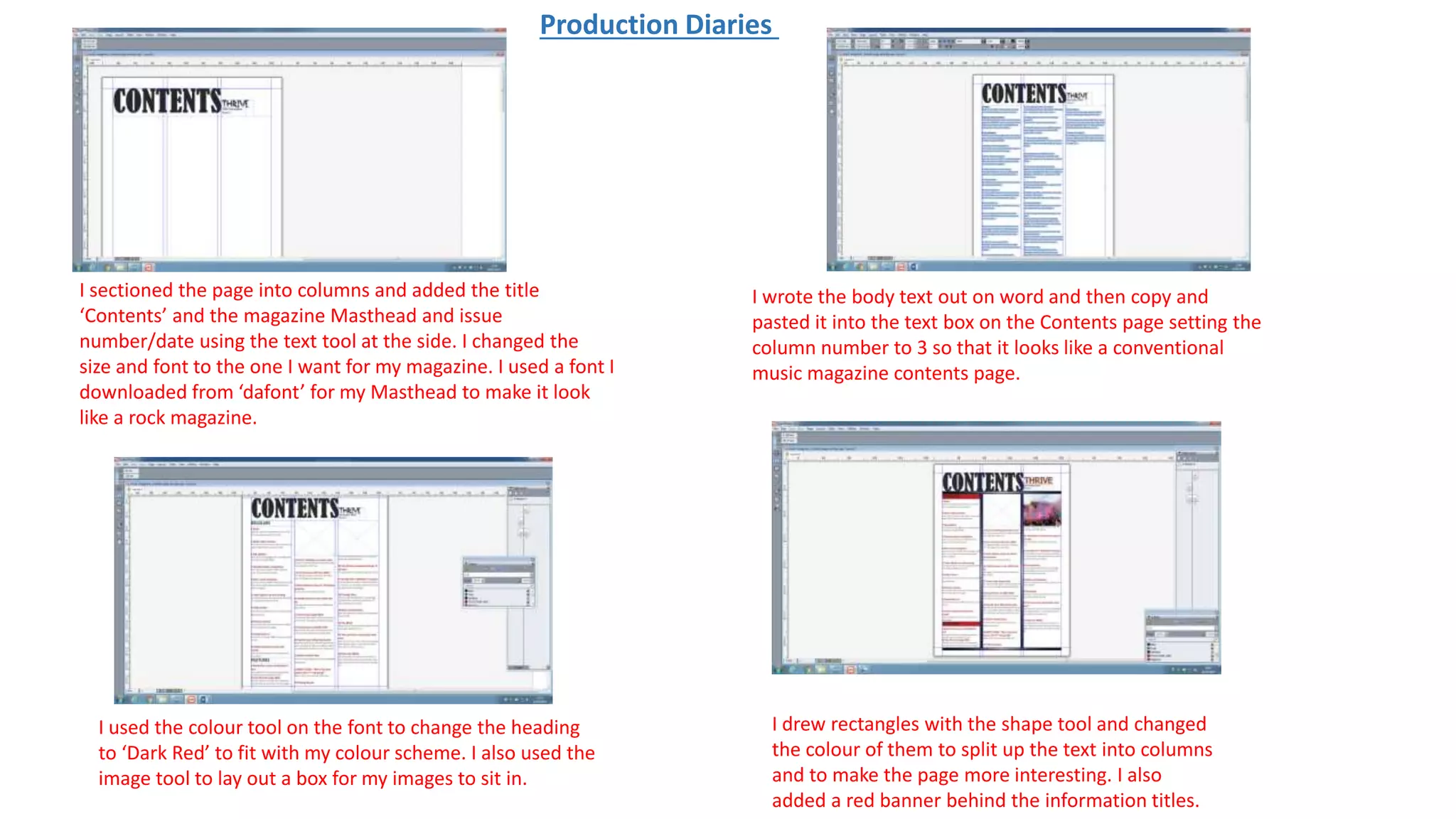 The document summarizes the steps taken to design the contents page of a magazine in Adobe InDesign. Key points include: