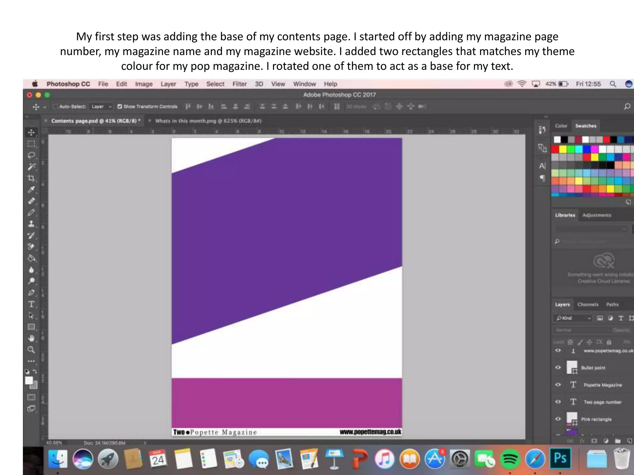 The document summarizes the steps taken to design a contents page for a magazine. Key steps included adding the magazine name and website, rotating rectangles to act as a base, creating a title using the word "Pop", positioning original pictures and adding headings and subheadings, adding page numbers in different colors, and overlapping transparent squares to create photo frames. Secondary images and a posters section were also included, along with social media logos and a selfie of the editor with a note about the magazine contents.