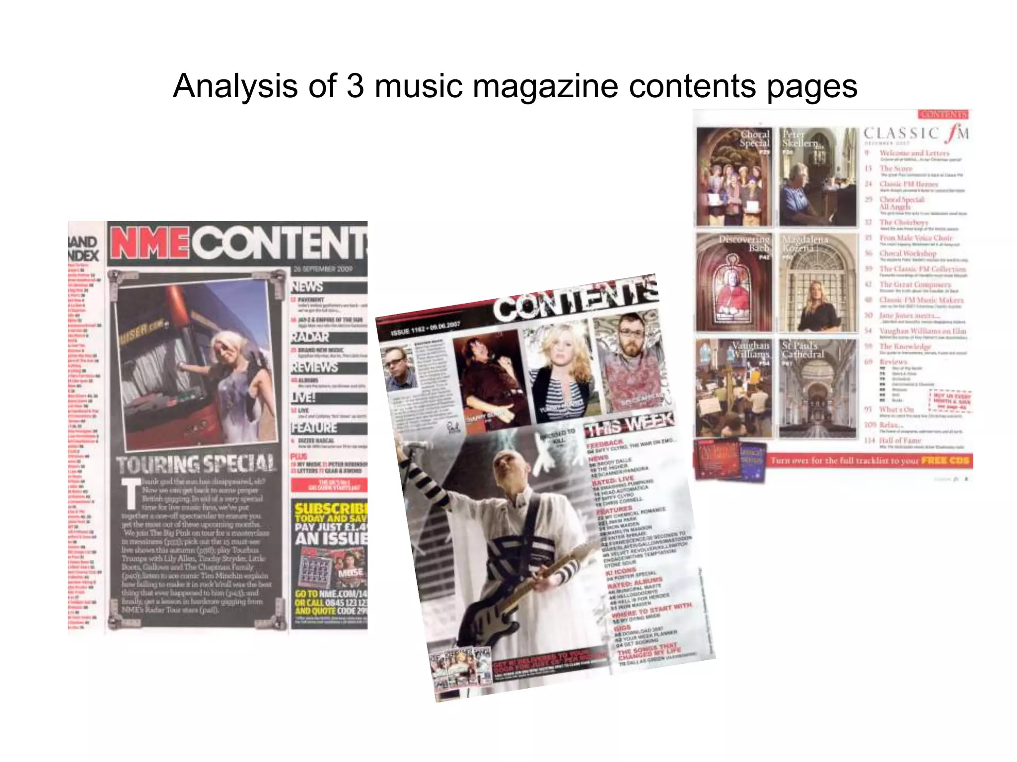 The contents page of NME magazine uses a consistent color scheme of red, black, and white throughout. Band names and page numbers are listed in the left column in red and black. The masthead matches the front cover. The main image shows a woman near a tour bus to advertise a piece on touring. An introductory letter from the editor makes readers feel included. Information in the bottom right encourages subscribing for future issues.