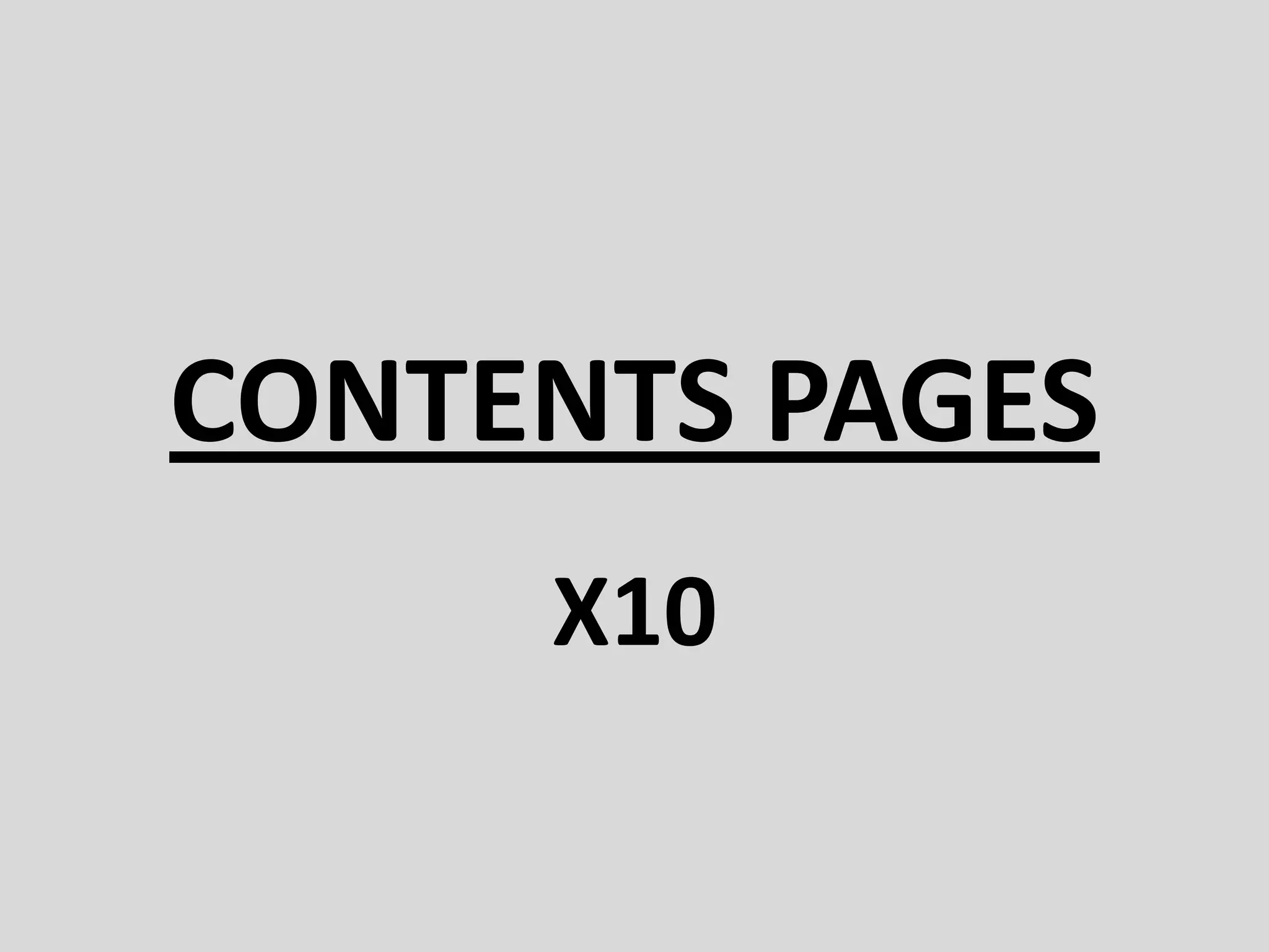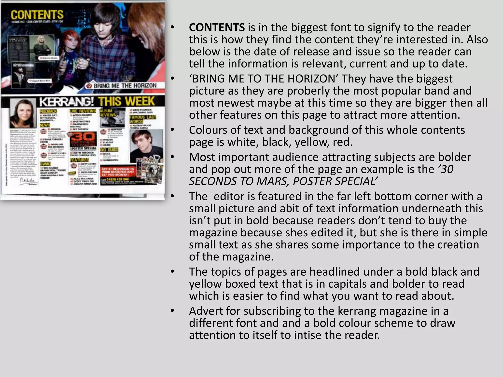 The document provides details from the contents pages of various magazines. It describes the layout, use of fonts, colors, images and other design elements used to highlight important sections and attract readers' attention. Key features mentioned include use of bold text and larger fonts to call out popular bands, articles and sections. Photos of famous musicians and celebrities are also used prominently to draw interest. Color schemes typically include some combination of black, red and white.