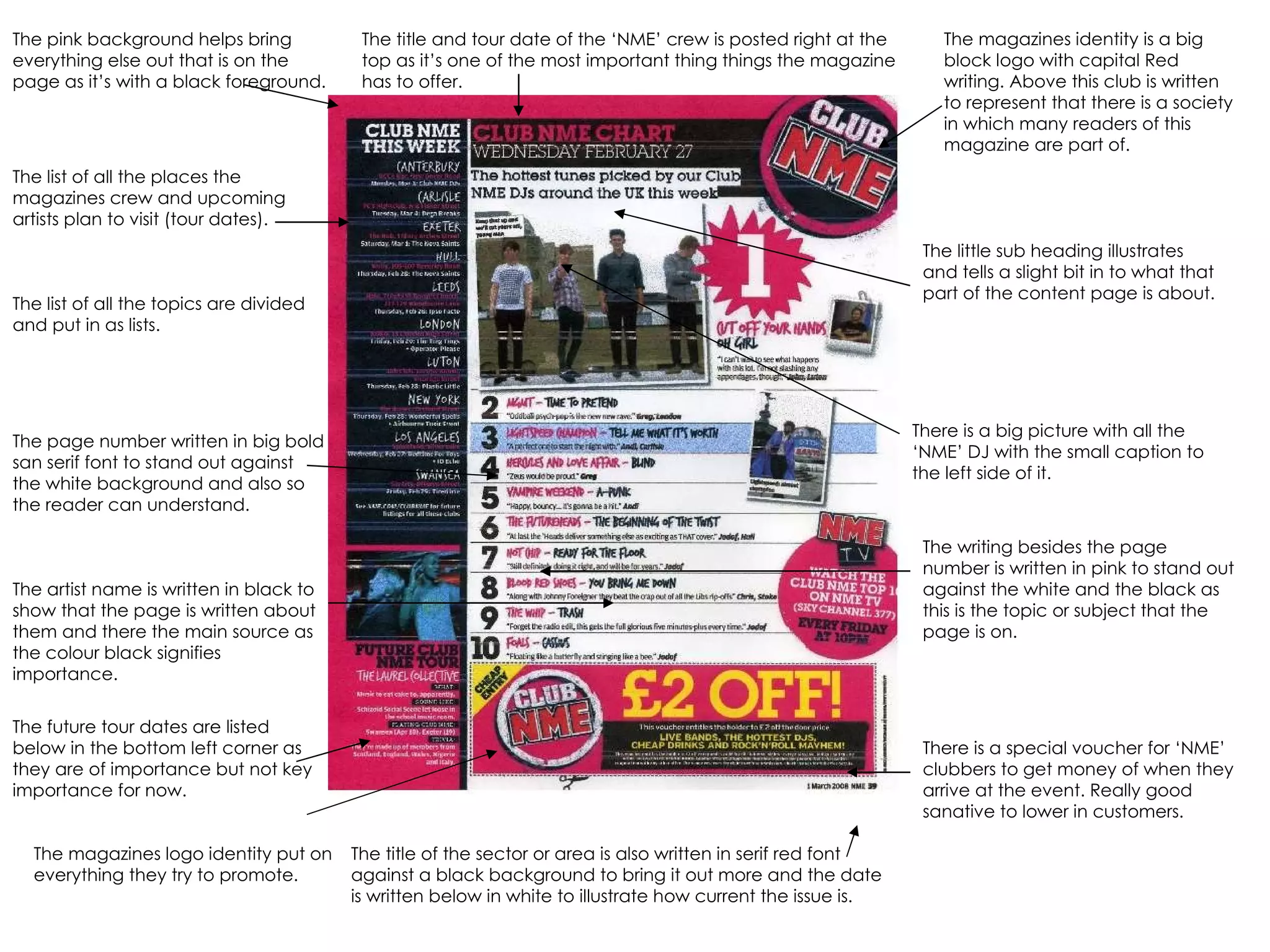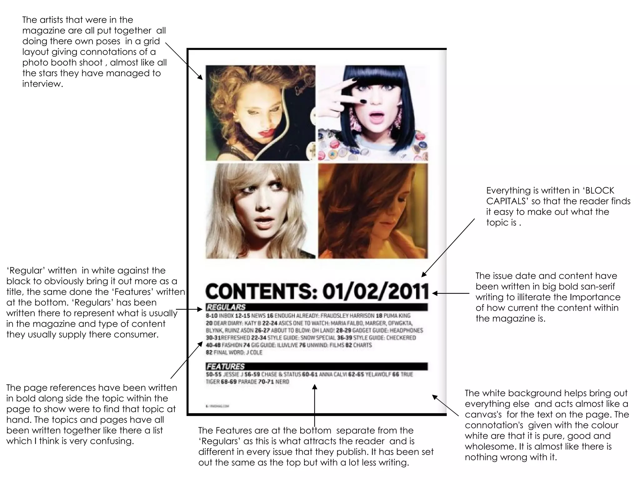 The document describes the layout and design of a magazine's contents page. It contains a grid of artist photos in the top section. Text is written in uppercase, bold, and different colors to stand out against backgrounds and clearly convey the content and page references. The contents are divided into sections for regular features, special features, tour dates, and interviews. Photos and lists are used throughout to illustrate the various articles and their topics within the issue.