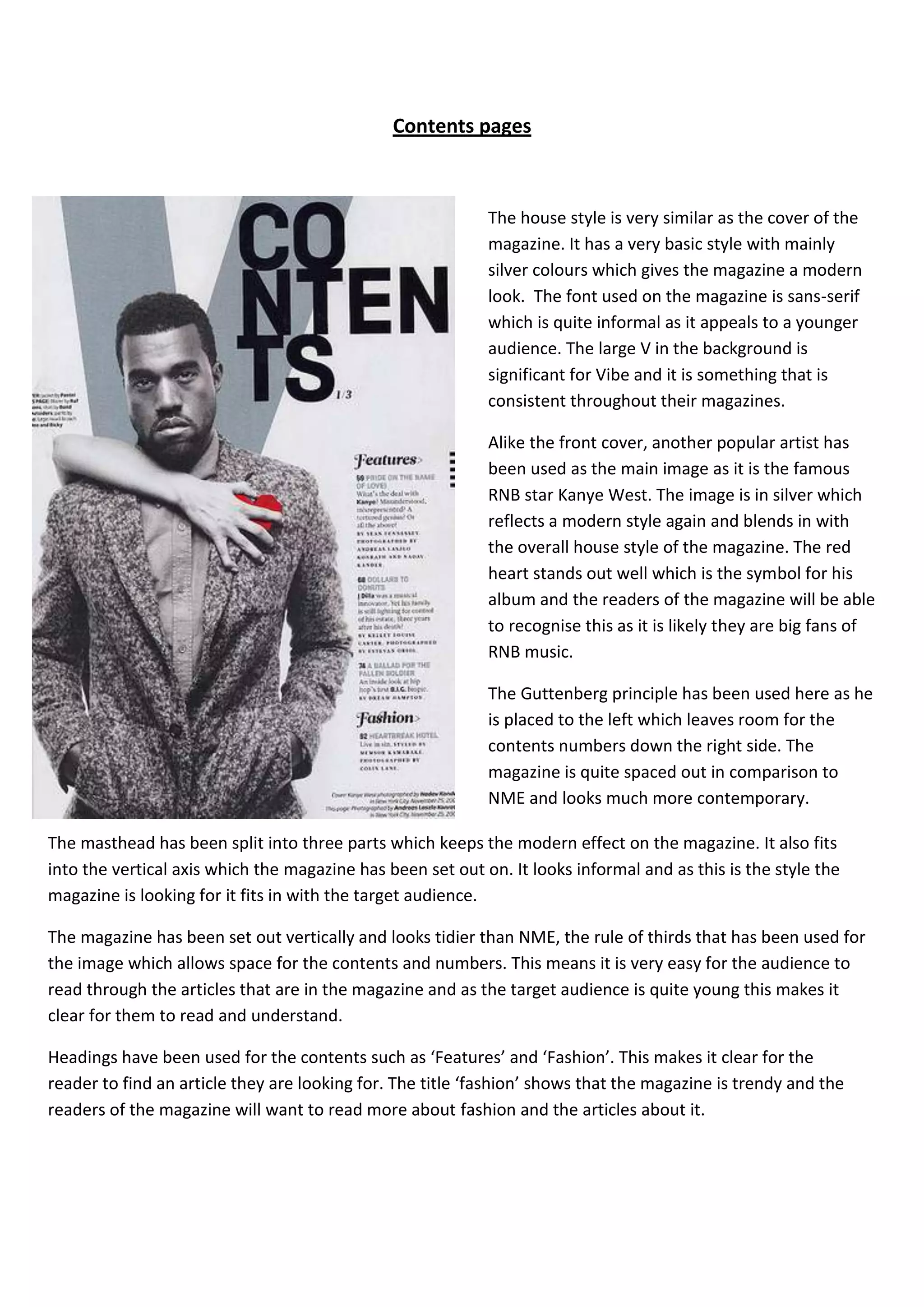 The document compares the contents pages of two music magazines - Vibe and NME. Vibe uses a minimalist design with silver colors and sans-serif font, appealing to a younger audience. It features a large image of Kanye West and uses vertical layout. NME uses varied colors and serif font for an older audience. It has a compact horizontal layout and images of Willow Smith and Prince Charles. Both magazines' contents pages match their distinct house styles.