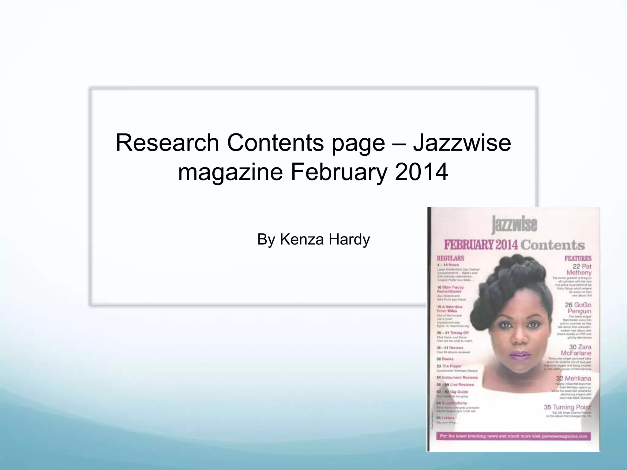 The document analyzes and summarizes the contents page of the February 2014 issue of Jazzwise magazine. It finds that the language uses typical jazz terminology and references important jazz artists. While the front cover appears aimed at different ethnicities, the contents page seems more focused on and appealing to middle-class audiences. Only one image is used, breaking convention, and the image and text colors are coordinated but not consistently throughout.