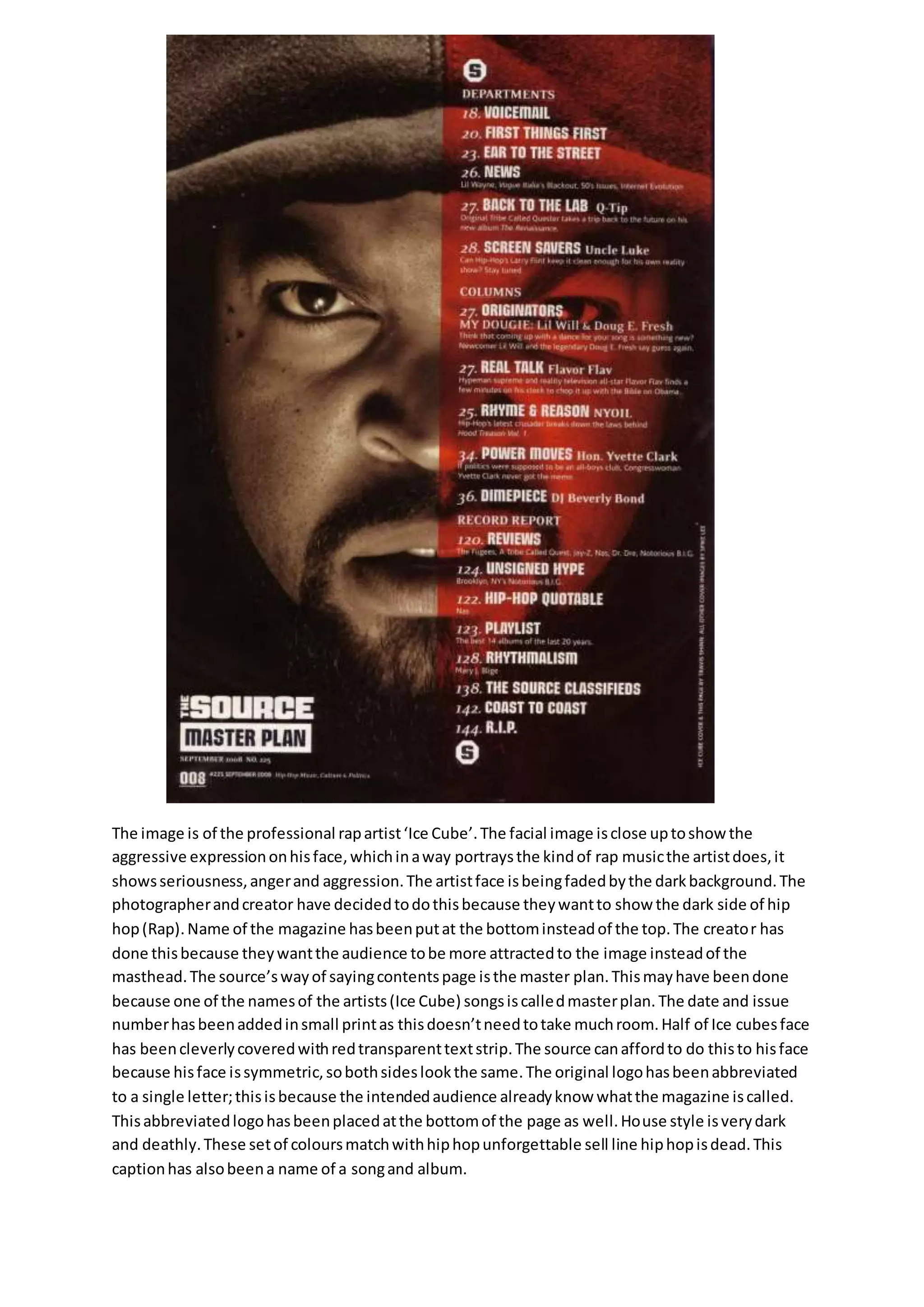 The document summarizes an image on the cover of a rap music magazine. The image features the rap artist Ice Cube in close-up with an aggressive expression, reflecting the serious and angry nature of his music. His face is faded into the dark background to portray the dark side of hip hop. Text and other design elements are used strategically throughout the image to highlight Ice Cube as the focus, match the dark tone of hip hop, and align with song and album titles from Ice Cube's discography. The magazine's logo, colors, and layout are also designed to look dark and unique in capturing the essence of hip hop culture.