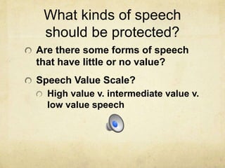 This document discusses various First Amendment principles related to freedom of speech, including: