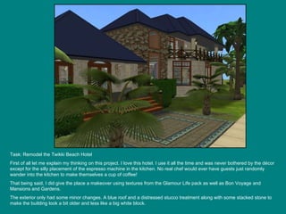 The document summarizes renovations made to the Twikki Beach Hotel. The exterior was updated with a blue roof, stone accents, and a wrapped stone sign post. Functionality was prioritized, adding walkways and removing archways. The lobby now has a fish tank, tiki decor, and grand staircase. Themed rooms were added - a log cabin room, tropical room, and oriental room. Common areas like the restaurant, bar, and coffee station were also renovated. The goal was to modernize the hotel while incorporating different vacation themes.