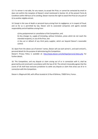 This document outlines the terms and conditions of a music quiz competition organized by Deezer. It states that the competition is open to UK residents aged 18 or older from June 13th to 23rd 2013. Five winners will be randomly selected and awarded two 4-day tickets to the Dour Festival in Belgium. The terms specify rules around eligibility, entries, prizes, and privacy.