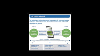 The document discusses the concept of context awareness in technology, emphasizing the importance of sensors such as GPS and accelerometers for creating situational awareness. It highlights various applications of context-aware technology, including personal agents and activity recognition, and outlines future steps involving new sensor hardware and machine learning. Additionally, it suggests creating marketplaces to better understand user intentions and improve the relevance of contextual services.