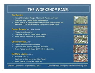 The document discusses context-based zoning and placemaking tools such as form-based codes. It provides an overview of the agenda and objectives which include discussing common principles of context-based zoning, typical elements of form-based codes, and examples of where these tools are being applied in New England. A panel of experts is also introduced who will discuss their experience with these placemaking approaches.