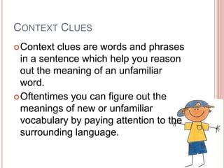 Context clues are hints in the surrounding text that can help determine the meaning of unfamiliar words. There are four main types of context clues: definition/explanation, which directly defines the word; restatement/synonym, which uses a similar word; contrast/antonym, which contrasts the word's meaning; and inference/general context, which relies on common sense to infer the meaning. Understanding context clues can help readers comprehend new vocabulary from context in what they are reading.