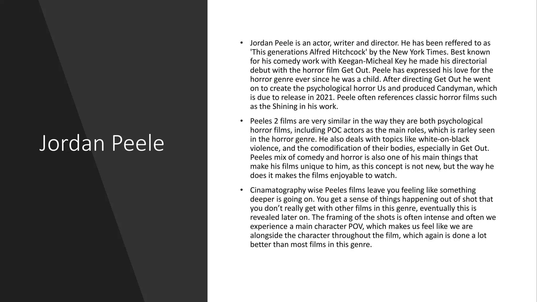 This document provides contextual information on several horror directors: Jordan Peele, Stanley Kubrick, and Alfred Hitchcock. It summarizes their backgrounds and styles. For Peele, it notes his background in comedy and how his films reference classic horrors while including diverse leads. For Kubrick, it discusses his unique directing style and character portrayals. For Hitchcock, it outlines his background in silent films and reliance on visuals and plot twists. The document also presents brief theories about common horror themes and definitions of genre. The proposal expresses interest in researching these influential directors to inform a new horror film project.