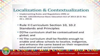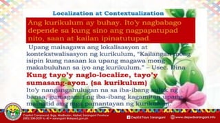 This document provides guidelines for developing contextualized instructional materials across K-12 curricula. It defines key terms like contextualization, indigenization, and localization. It also classifies different types of instructional materials like printed and non-printed resources. Guidelines are provided for developing learning activity sheets, including ensuring materials are self-explanatory, based on learning targets, and use clear fonts and illustrations appropriate for different grade levels. The overall goal is to develop materials that make the curriculum relevant and meaningful for learners.