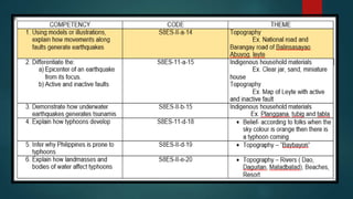 The document discusses topography and how earthquakes have impacted the local area of Balinsasayao, Abuyog. It notes that an earthquake caused the current street structure to become misaligned, with faults in the area moving and offsetting roads up to 17.2 mm/yr. It emphasizes being mindful of building in areas with faults due to earthquake risks, and suggests having evacuation plans and emergency kits ready.