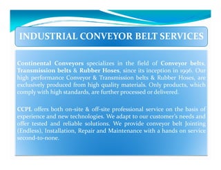 Continental Conveyors specializes in high-quality conveyor belts, transmission belts, and rubber hoses, offering products made from durable materials since 1996. They provide a wide range of conveyor solutions, including installation, repair, and maintenance, while ensuring products meet international standards and customer-specific needs. Their offerings include specialized belts for various industries, innovative repair solutions, and consulting services to enhance operational efficiency.