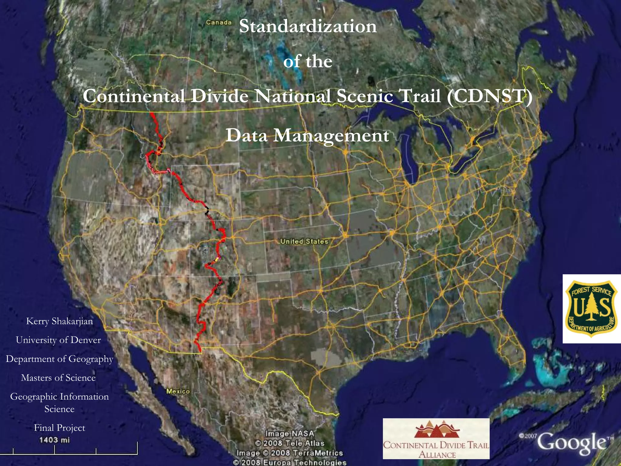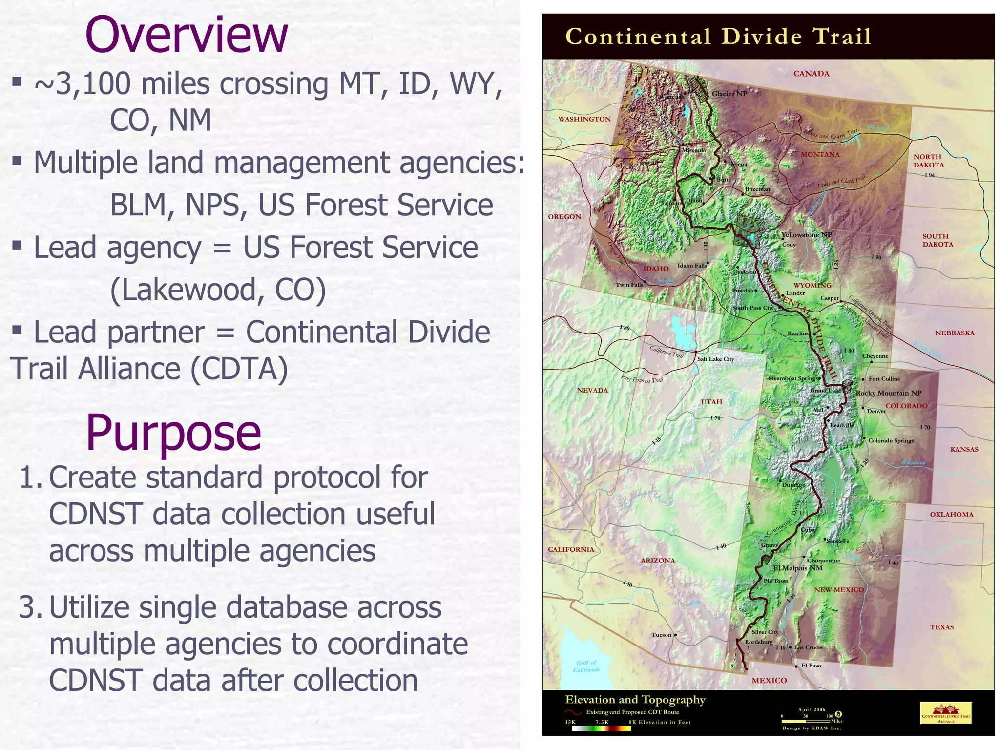 This document outlines a proposal for standardizing data collection and management for the Continental Divide National Scenic Trail (CDNST) which crosses multiple states and is managed by several federal agencies. It proposes developing a standardized data dictionary and GPS protocols to ensure consistent collection and coding of trail features and attributes. Data would be stored and managed centrally using a multi-user ArcGIS geodatabase maintained by the Continental Divide Trail Alliance to facilitate coordinated management across agencies. Field testing of equipment and methods is recommended to refine the standards which aim to resolve inconsistencies and improve collaboration among the multiple jurisdictions overseeing the CDNST.