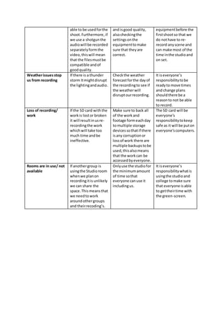 This document outlines potential issues that could arise during the production of an IRN BRU advertisement and contingency plans to deal with them. It identifies four categories of issues: technical, organizational, logistical, and personnel. Several potential problems are listed under each category along with the expected effect on production, a proposed solution or control measure, and the person responsible. Some examples include not having enough people if someone is ill, technical issues with camera equipment, poor audio or video quality, weather interfering with recording, loss of recorded work, and rooms not being available as scheduled. Contingency plans include postponing recordings, borrowing equipment, testing equipment functionality, backing up work, and efficiently using facilities. The responsibilities of crew members are also defined
