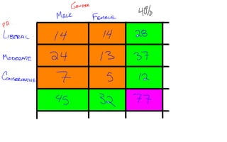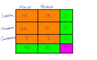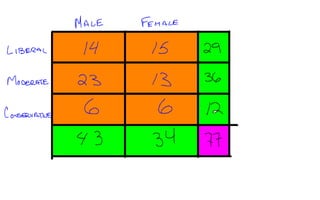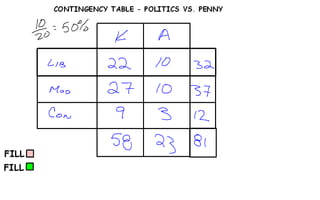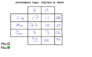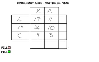 Data collected from all classes on gender, political affiliation, and opinion of the penny, then organized into a contingency table.