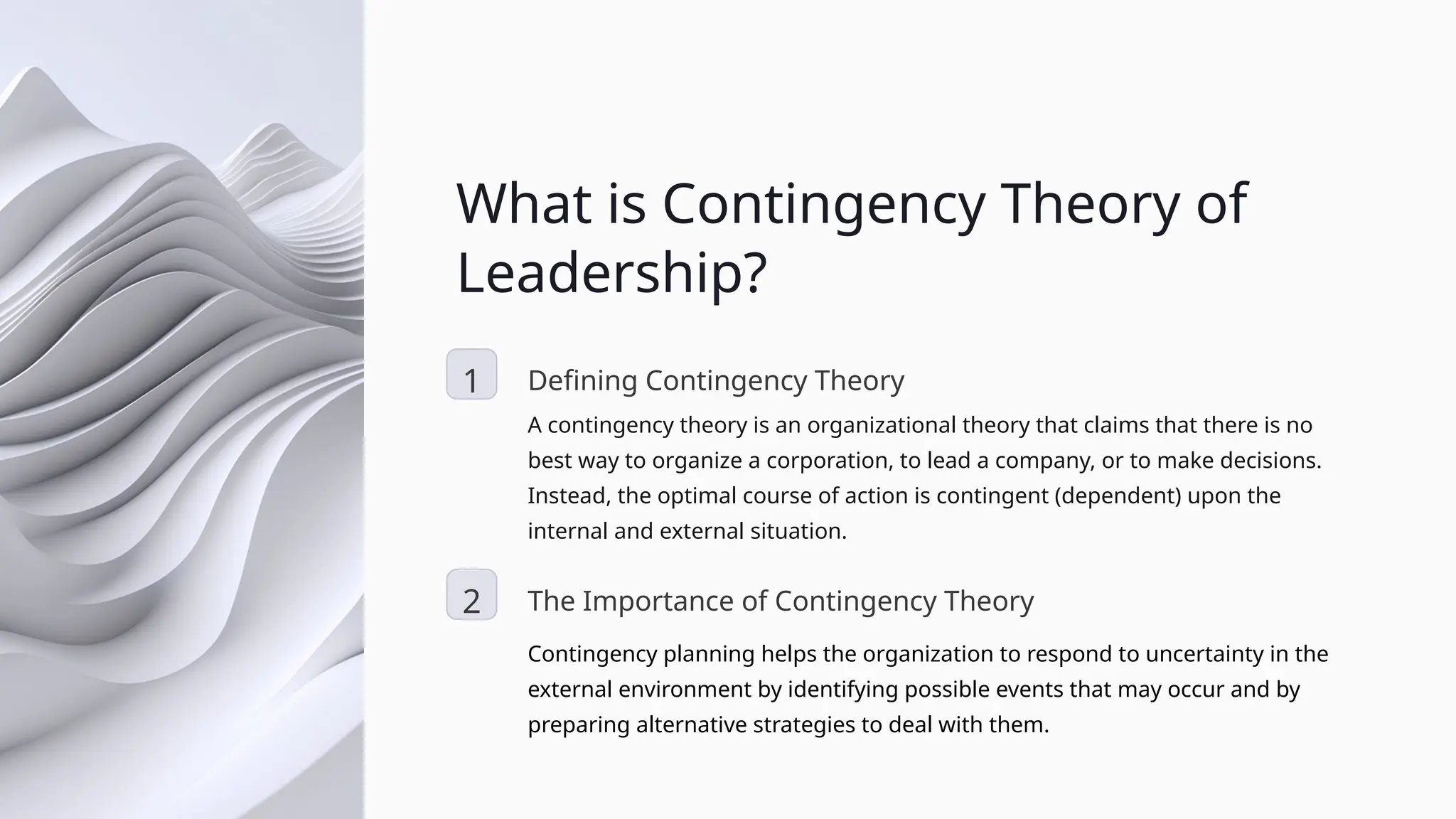 The document outlines contingency theory in leadership, asserting that effective leadership varies based on internal and external situational factors. It emphasizes the importance of adapting leadership styles to specific contexts, enhancing responsiveness to organizational needs. The theory is particularly useful in fostering collaborative environments and improving leadership training across various industries, including manufacturing.