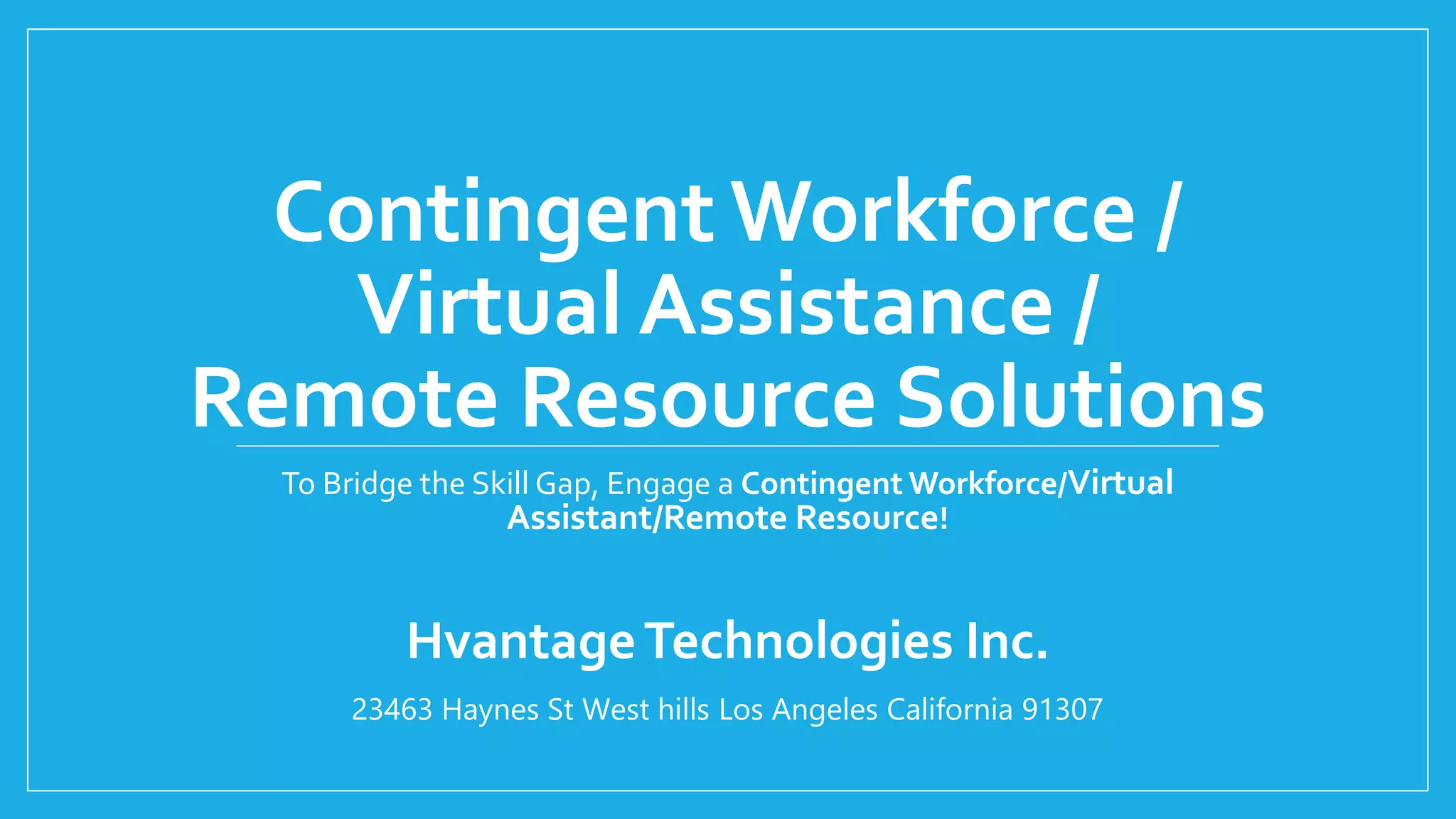 Hvantage Technologies provides contingent workforce, virtual assistance, and remote resource solutions to help businesses address skill gaps. This includes freelancers, independent contractors, consultants, temporary or seasonal employees, virtual assistants, and remote workers. Hiring these contingent resources provides businesses flexibility and reduced costs compared to permanent employees while ensuring work quality and continuity of operations. Hvantage has expertise across many industries and functions and promises personalized service, competitive pricing, and timely fulfillment of resource needs.