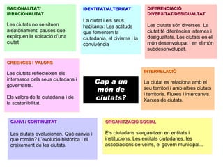 Conceptes socials clauRACIONALITAT/ IRRACIONALITAT Tot succeeix per unes raons i tot té unes conseqüències. Fa comprendre la complexitat dels fets i fenòmens socials . Afavoreix la formació d’un pensament crític i relatiu. IDENTITAT/ALTERITAT Compartim el món amb els altres. Ens permet prendre consciència de com som i de com son els altres. Potencia el sentit de la tolerància i del respecte pels altres i per la defensa dels Drets Humans. DIFERENCIACIÓ DIVERSITAT/DESIGUALTAT La diversitat és riquesa cultural i la desigualtat, injustícia social. Permet treballar el respecte per la diversitat i prendre consciència de l’existència de desigualtats i injustícies per erradicar-les INTERRELACIÓ/CONFLICTE Les persones i els grups són interdependents. Es comuniquen, s’interrelacionen, intercanvien... Les relacions entre grups generen conflictes i també permeten ensenyar el sentit de la cooperació i de la solidaritat. CANVI / CONTINUITAT Unes coses canvien i altres perduren. Facilita comprendre que les coses no han estat sempre iguals i que poden continuar canviant, o no. Es pren consciència de l´herència que deixem a les generacions futures. ORGANITZACIÓ SOCIAL Les persones i els grups s’organitzen.Facilita la comprensió de l’org anització social, les estructures de poder, l’org anització política dels territoris, dels estats, de les persones. A través de l’organització social s’educa per a la participació social i política i la implicació en els problemes socials CREENCES I VALORS Reflecteixen les diferents maneres d’entendre el món. Donen lloc a codis ètics a partir dels quals actuen els grups i les persones. Els valors democrà- tics es reconeixen fonamentals perquè faciliten la convivència a través del diàleg i el consens. Així com el valor de la sostenibilitat.