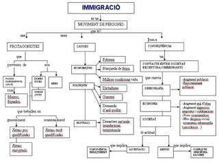 RACIONALITAT/ IRRACIONALITAT Quinessón les causes de la immigració? I les conseqüències? Què opinen els partits polítics? I els mitjants de comunicació? Què en pensem sobre la immigració?per què? IDENTITAT/ALTERITAT Hi ha algun immigrant a la meva família?I a la dels companys? D’on són? Quins són els trets culturals que ens caracteritzen com a individus i com a societat? Quins trets culturals caracteritzen els diferents immigrants? DIFERENCIACIÓ DIVERSITAT/DESIGUALTAT Com vivim nosaltres?Com viuen els nostres nous veïns? Tots vivim igual? El contacte entre cultures com un fet enriquidor. Els drets i deures de les persones. Tothom té els mateixos drets? INTERRELACIÓ Quina relació mantenen els immigrants amb el seu país d’orígen? Quina relació mantenen amb el cercles més proper (escola, barri, veins)? Com els acollim? Com ens hi relacionem? CANVI / CONTINUITAT Sempre hi ha hagut immigració o és un fenòmen nou? Les raons per immigrar són sempre les mateixes? Comparació de les diferents onades immigratòries a Catalunya (anys 60/70 i immigració actual) ORGANITZACIÓ SOCIAL Les polítiques sobre immigració. Són favorables? Són d’exclusió o són multiculturals? Com s’organitzen els immigrants? Com ens organitzem nosaltres? Associacions i ONG’s que sensibilitzen sobre el tema. Ens organitzem conjuntament? Activitats realitzades CREENCES I VALORS Com són els immigrants? Com som nosaltres? TEMA: PREJUDICIS I ESTEREOTIPS JO TAMBÉ SÓC IMMIGRANT ?