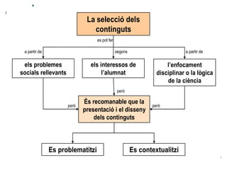 La selecció iseqüenciació dels continguts: un currículum en espiral SELECCIÓ DE CONTINGUTS SEQÜENCIACIÓ DE CONTINGUTS Quins són els coneixements rellevants per a un ciutadà (no expert)? Selecció de continguts necessaris (transversalitat) per al coneixement i interpretació de problemes socials rellevants (funcionalitat) Del més simple al més complex, del més concret al més abstracte, segons el nivell de maduresa de l’alumnat. Establint relacions entre continguts de les diferents àrees/ matèries.