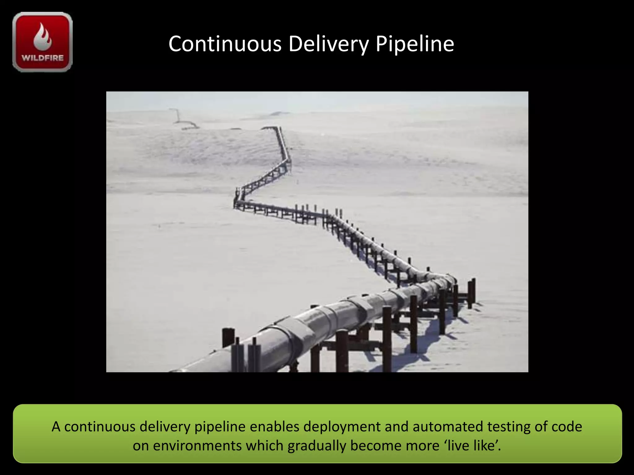 The continuous delivery pipeline consists of multiple environments through which code passes automated testing before potential deployment. It begins with developers writing code and running unit tests locally. The code is then checked into source control, triggering jobs on the continuous integration environment that rerun the unit tests. If tests pass, the code is promoted to the test automation environment where automated acceptance tests are run. If those pass, the code moves to the staging environment for more testing before potential release to production, where a final set of tests validate the deployment.