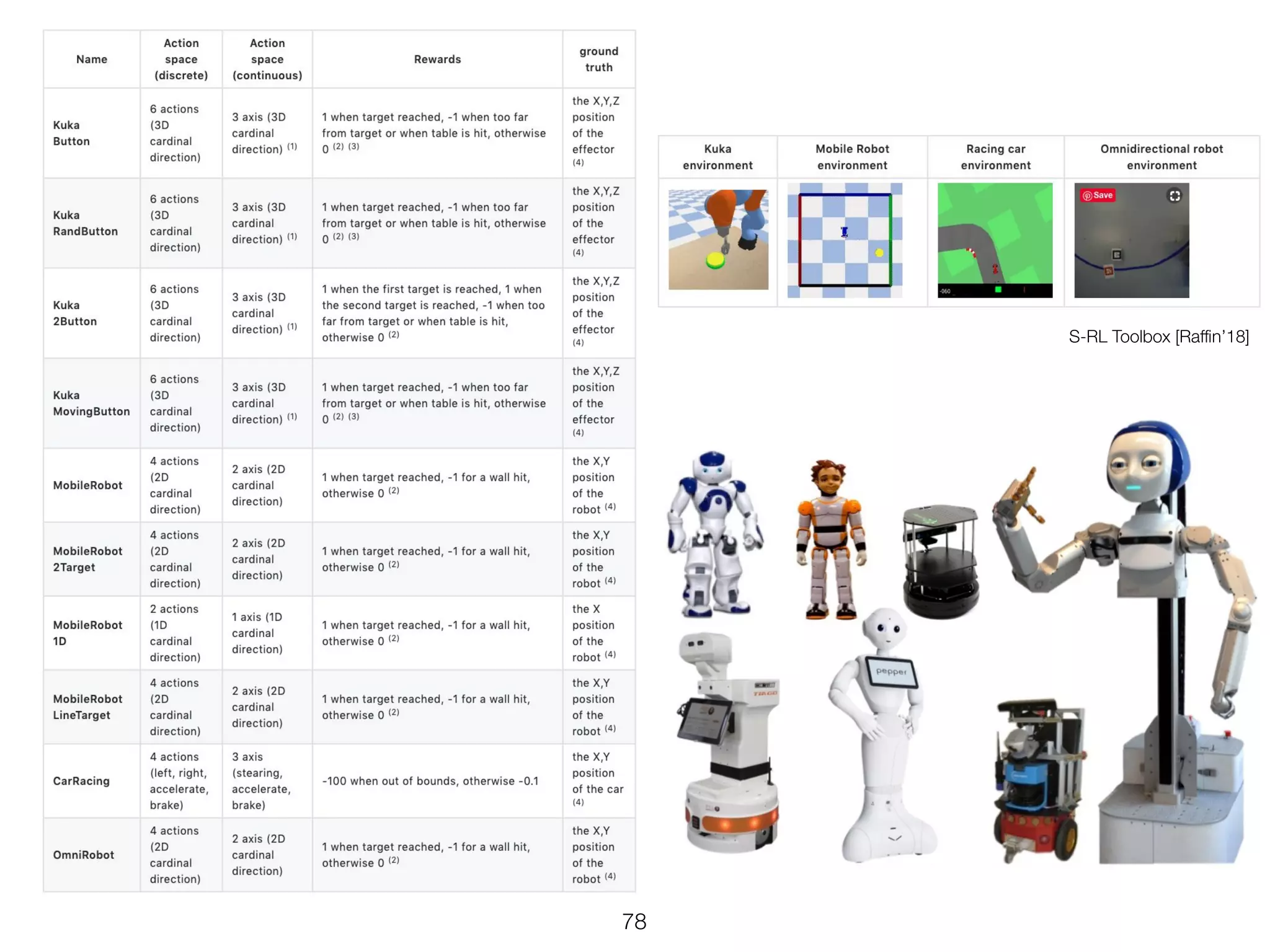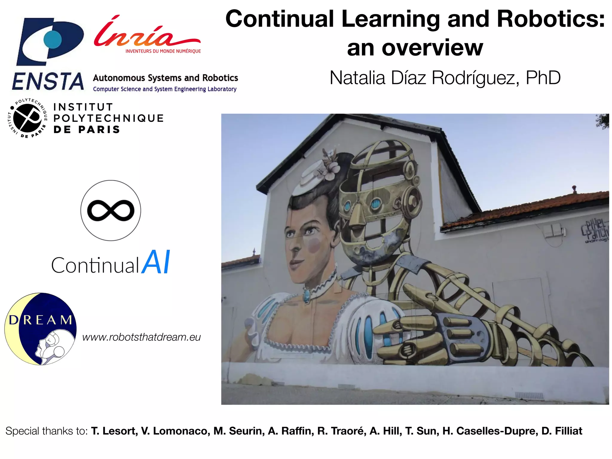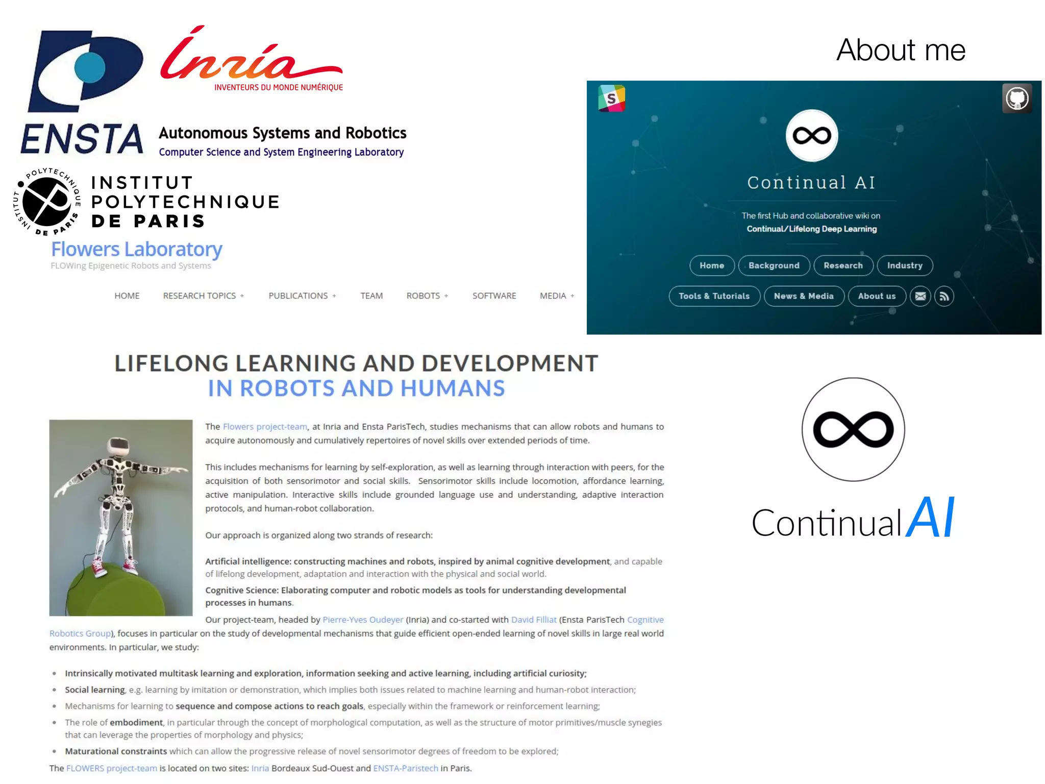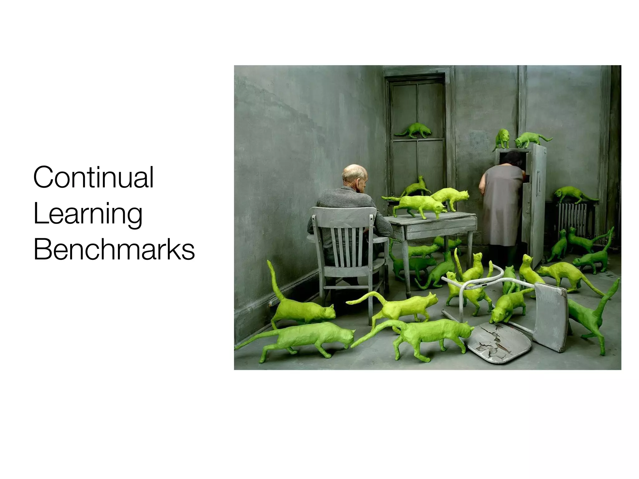 This document provides an overview of continual learning and state representation learning, including key papers in the fields. It summarizes various benchmark datasets used to evaluate continual learning models, such as MNIST, Fashion MNIST, and CORe50. Environments used to evaluate state representation and reinforcement learning are also cited, including ViZDoom and CRLMaze. Overall modeling approaches discussed include convolutional neural networks, policy distillation, and sim-to-real transfer for continual reinforcement learning.