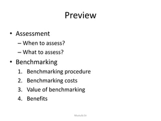 This document discusses methods and techniques for continual service improvement. It provides notes on assessment and benchmarking. Assessments compare operational processes to performance standards to identify areas for improvement. Benchmarking involves evaluating processes against best practices in the industry. The document lists benchmarking procedures, costs, value, and benefits. It explains that assessments and benchmarking are formal methods used to gauge performance and identify ways to enhance processes.