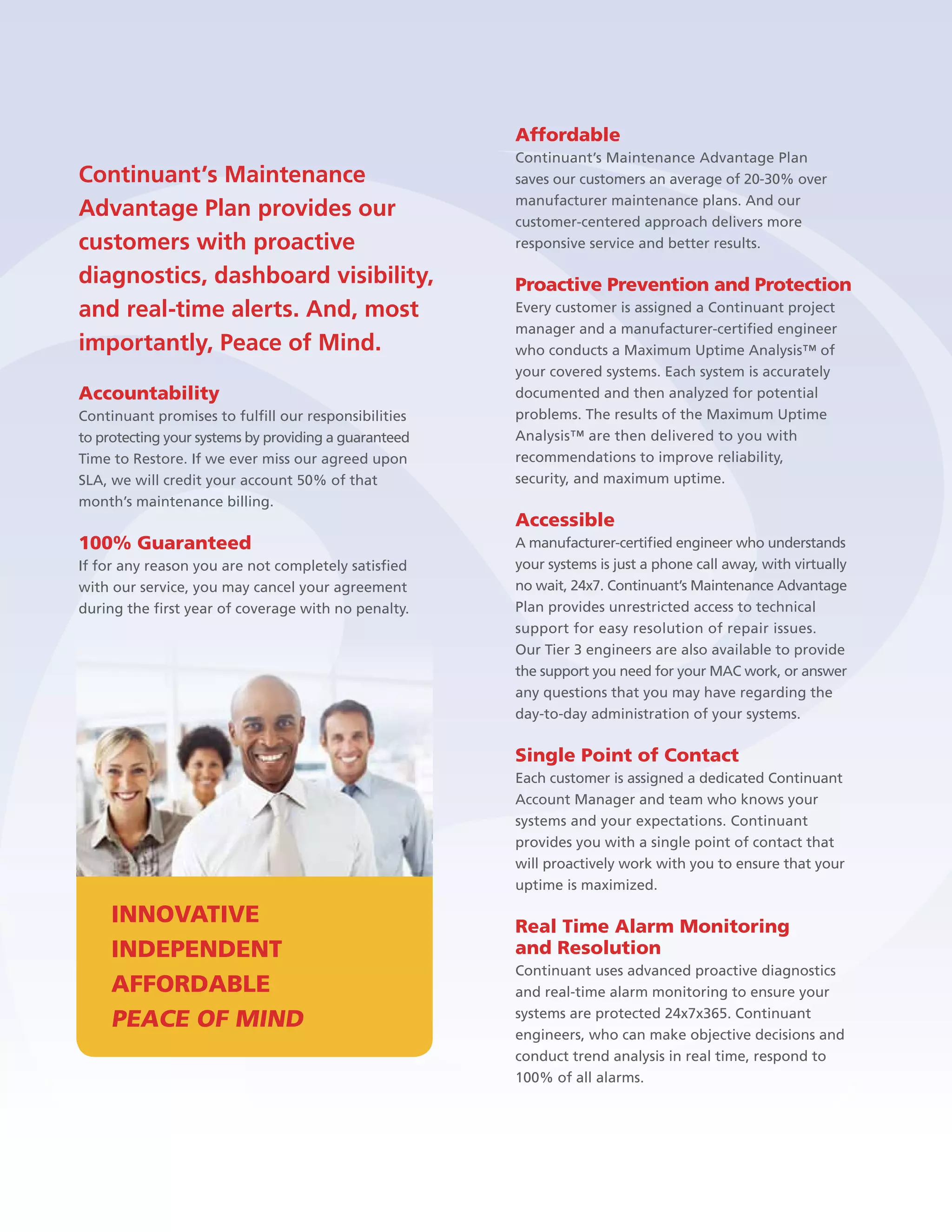 Continuant's Maintenance Advantage Plan offers a cost-effective alternative to traditional manufacturer maintenance plans, providing 24/7 support and access to certified engineers, resulting in customer savings of 20-30%. The plan includes proactive diagnostics, real-time alerts, and a dedicated account manager to ensure maximum uptime and service reliability. Customers receive a complete parts and labor warranty with customizable alarm notifications and simplified billing for transparent maintenance costs.
