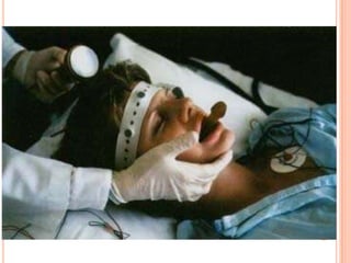 ECT (electroconvulsive therapy) has been used for over 50 years to treat various psychiatric conditions. It involves inducing a seizure through electrical stimulation of the brain. Common side effects include temporary memory loss and confusion. Nursing interventions involve explaining the procedure, monitoring the client during and after treatment, and providing support and structure to minimize confusion. Psychotherapy can promote confidence and functioning through trust and communication. Individual and group therapies are used, with the latter involving clients interacting to benefit each other. Complementary therapies like yoga, meditation, and herbal medicines are also used in psychiatric treatment.
