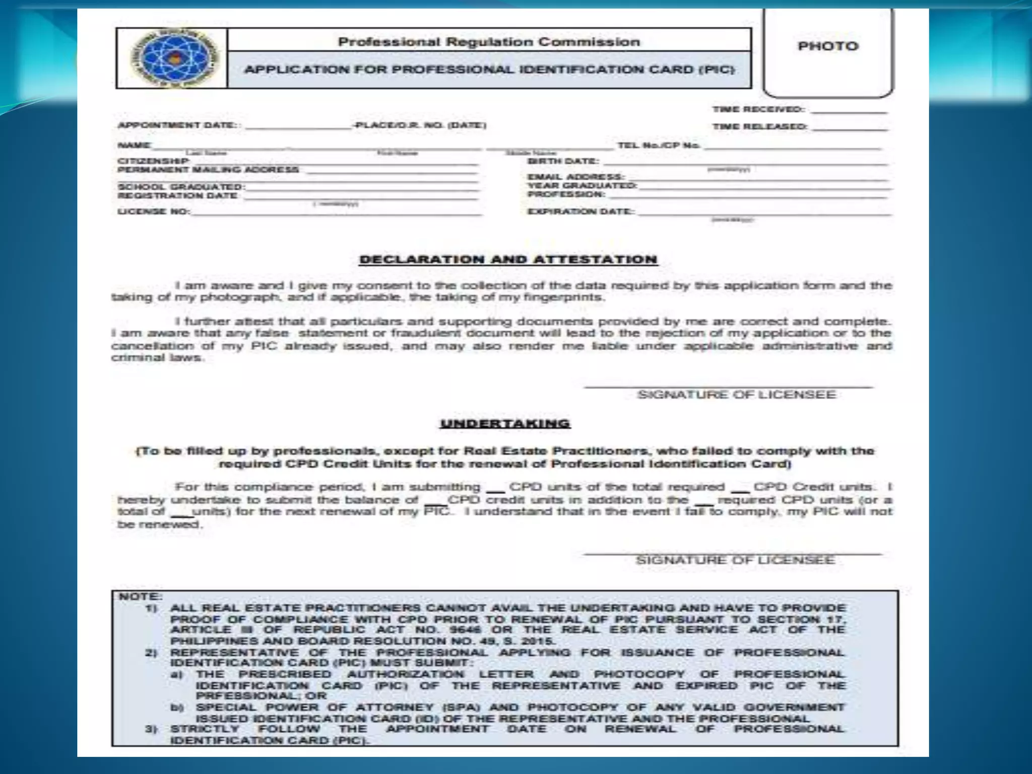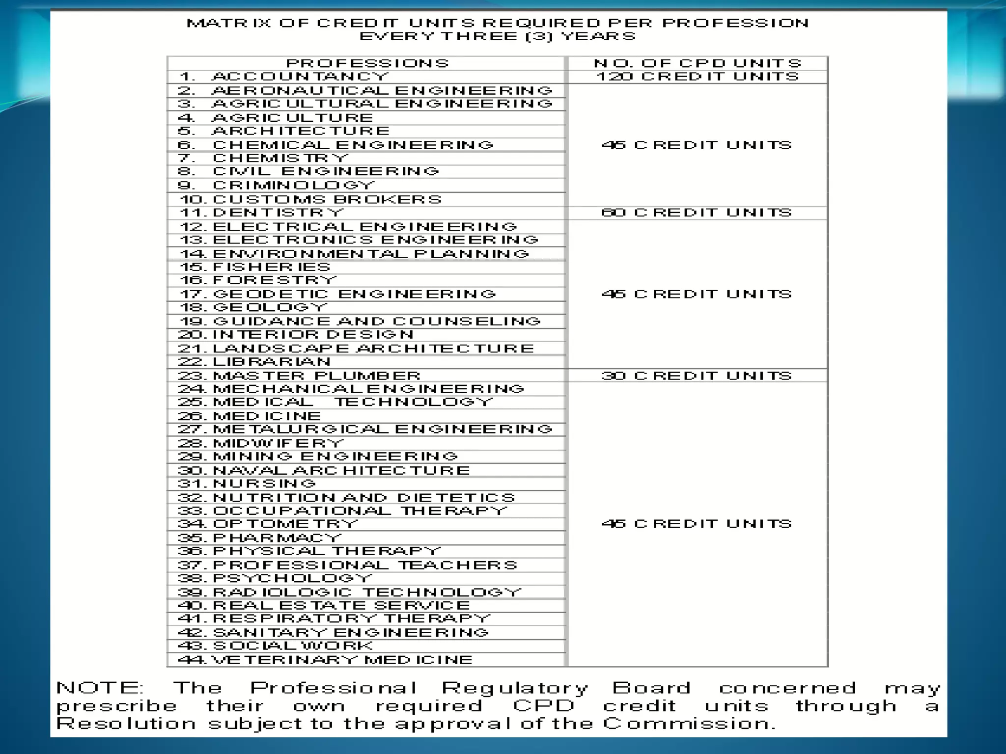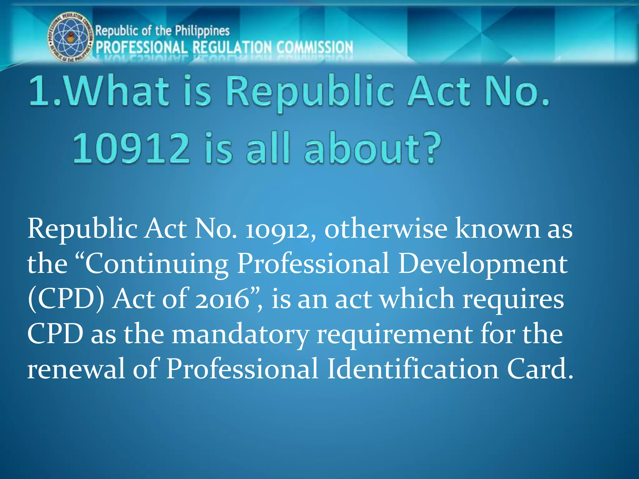 The Republic Act No. 10912, also known as the CPD Act of 2016, requires professionals to earn continuing professional development (CPD) credits for renewal of their professional identification cards. The act took effect in August 2016 and implementation began in March 2017. It establishes a transitional period where professionals must earn a percentage of their required CPD credits for renewal, starting at 30% in 2017 increasing to 100% in 2019. Several boards also published resolutions with unique transitional periods for their respective professions, such as teachers, accountants and nurses. The act and implementing rules provide guidelines for CPD providers, credit applications and fees.