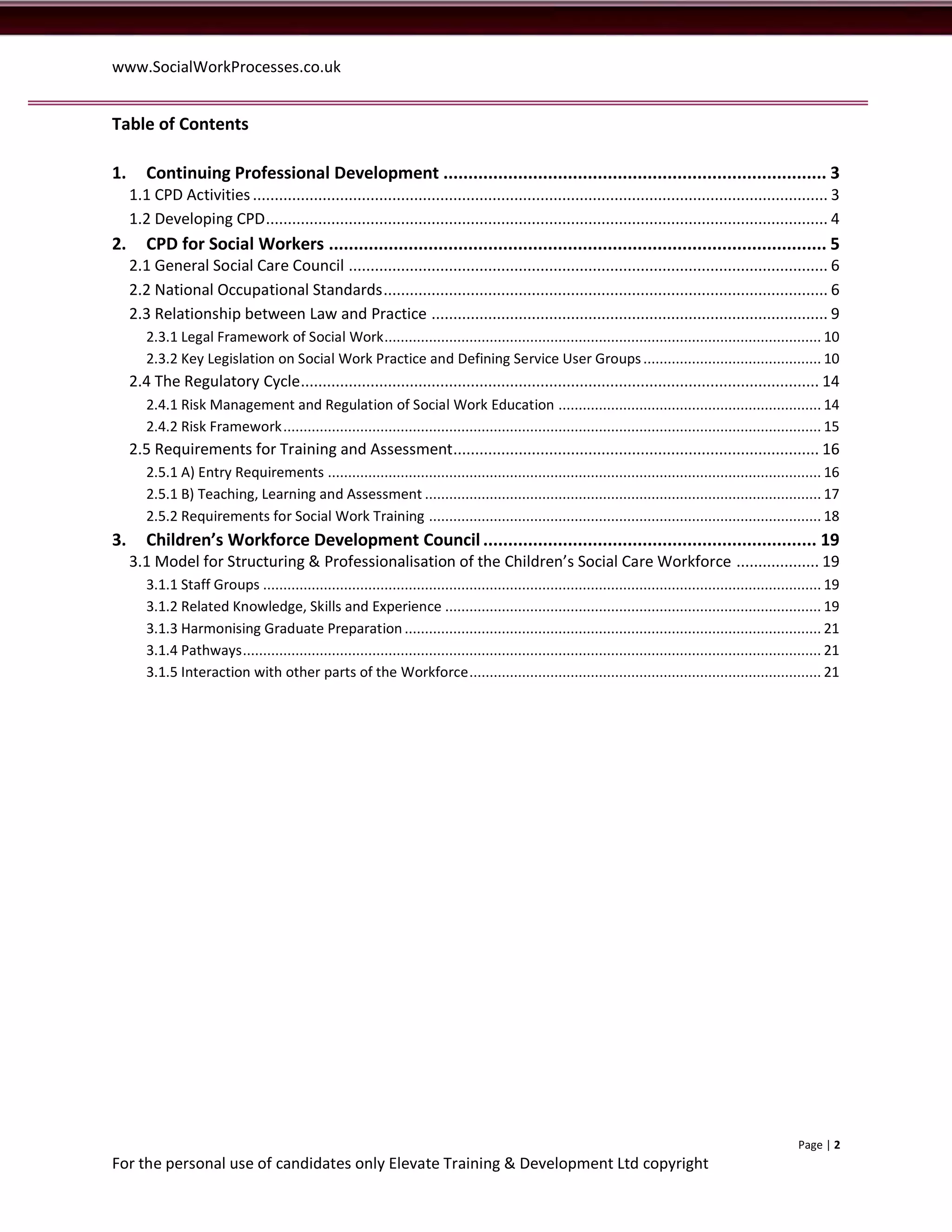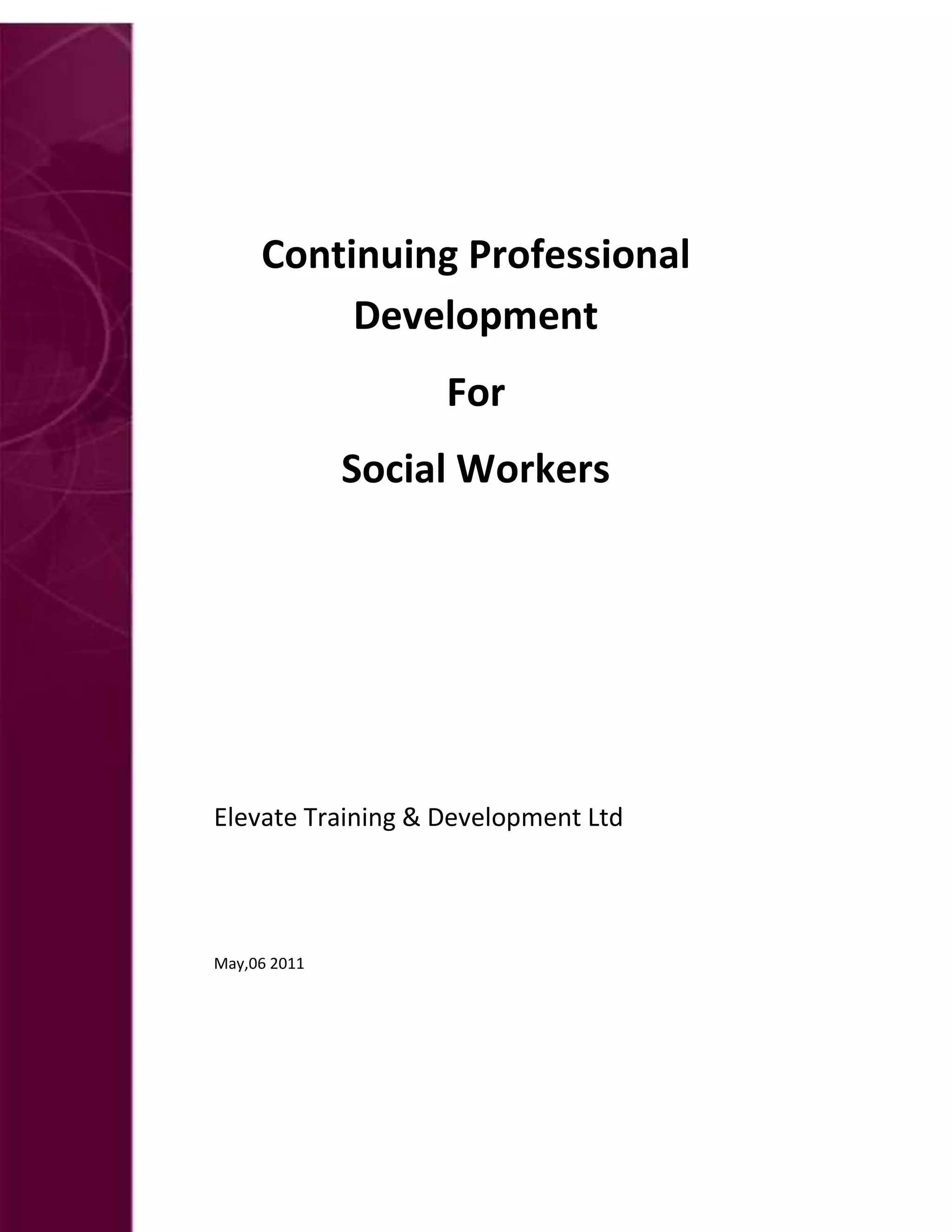 This document discusses continuing professional development (CPD) for social workers in the UK. It defines CPD and outlines common CPD activities like training, supervision, and qualifications. It also describes the regulatory bodies that oversee social work, including the General Social Care Council and requirements for maintaining registration. Finally, it discusses the national occupational standards that inform social work practice and the Children's Workforce Development Council's model for structuring the children's social care profession.