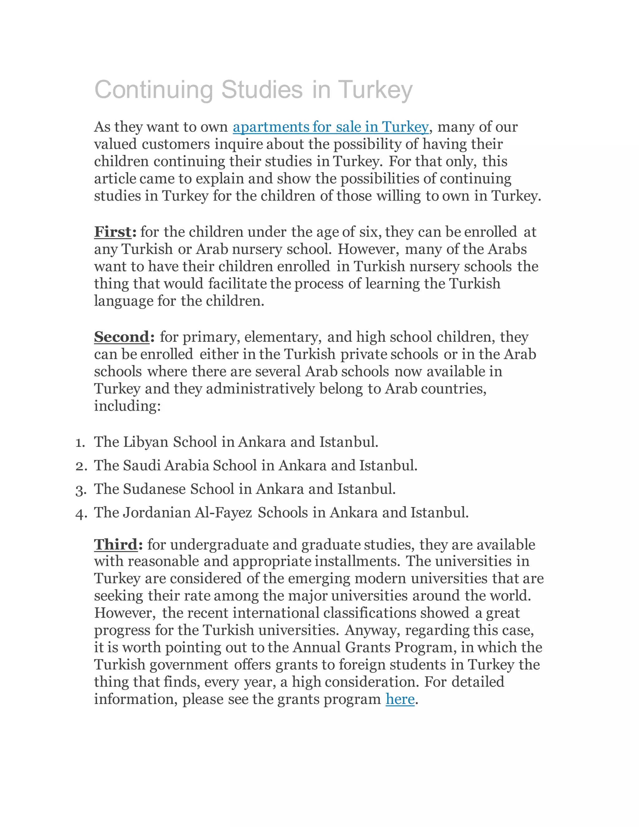 This document outlines the educational opportunities in Turkey for children of prospective property owners, including options for nursery, primary, secondary, and higher education. It emphasizes the enrollment process in Turkish and Arab schools, the affordability of living and education, and the cultural diversity of Turkey. Additional services offered include assistance with enrollment, document translation, and transport arrangements.